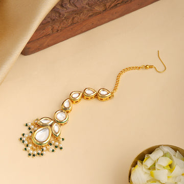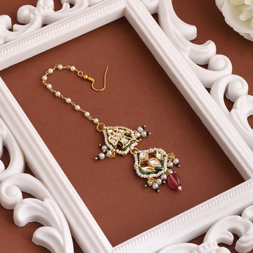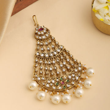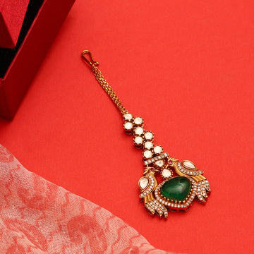 This exquisite maang tikka is part of the "Chandni" collection that features a regal design...
