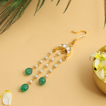 Delicate, graceful, and rooted in tradition, this Pearl and Pastel green Stone Maang Tikka is...
