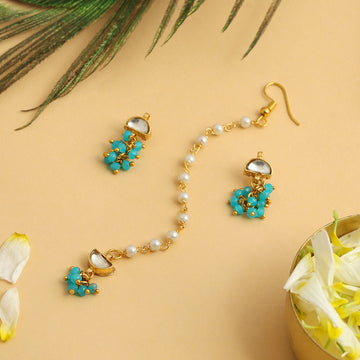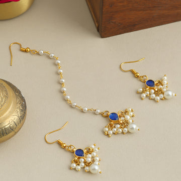 Adorned with pearls and vibrant blue stones, this exquisite maang tikka and earring set captures...
