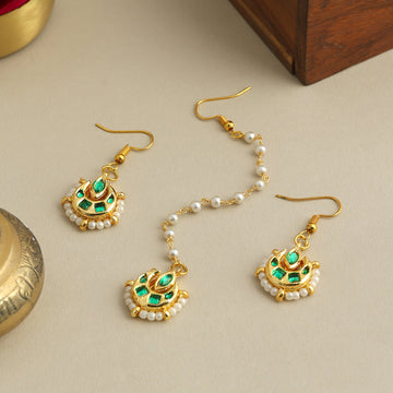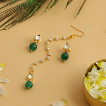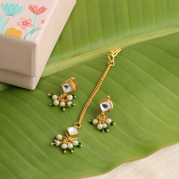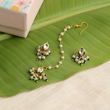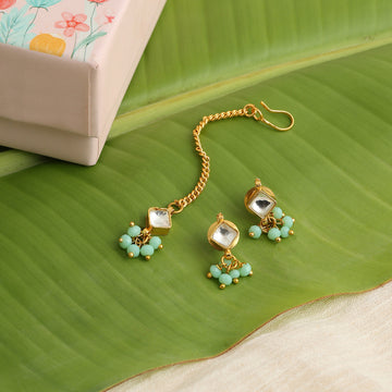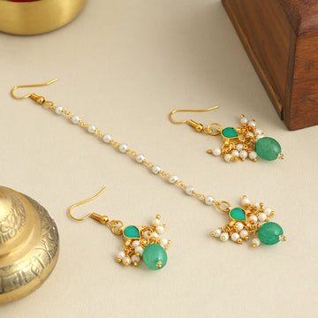 Delicate, graceful, and thoughtfully handcrafted, this Pearl and Pastel Green Stone Maang Tikka & Earring...