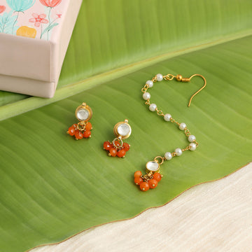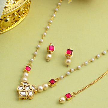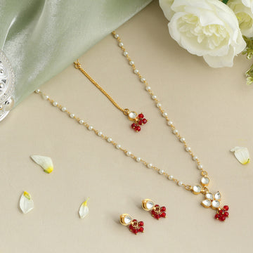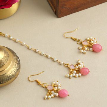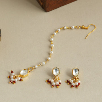 This delicate Pearl and Ruby-Tone Maang Tikka & Earring Set is inspired by the quiet...