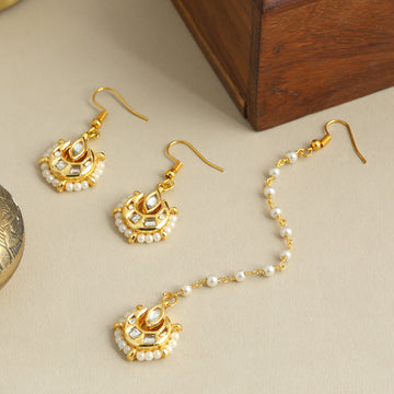Embrace the ethnic look with this gold-plated white kundan stone studded Maang Tikka and Earrings...
