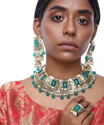 Ruby Raang Gold Plating Emerald Neckpiece With Earrings And Ring.