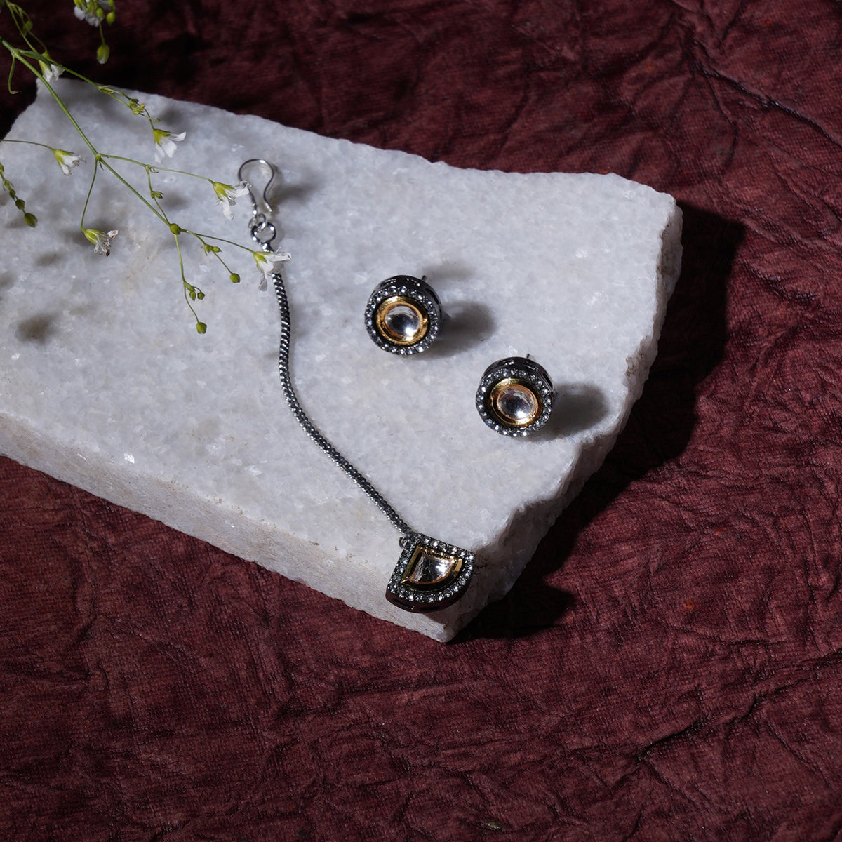Get ready to dazzle on your special day with our Dual Kundan Stone Maang Tikka & Earrings! These modern, gold-plated treasures are an absolute must-have for any bride or bridesmaid. The exquisite dual-stone design adds a touch of elegance and sophistication to any wedding ensemble. Crafted with precision and adorned with Kundan stones, these accessories are sure to make heads turn. Whether you're a bride looking to make a statement or a bridesmaid wanting to add some sparkle to your look, our Dual Kundan Stone Maang Tikka & Earrings are a perfect choice. Get ready to shine and make memories that last a lifetime!