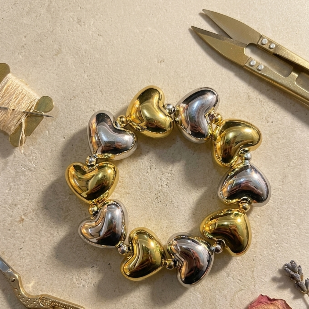 TAGS: heart bracelet, dual tone bracelet, gold silver bracelet, stretch bracelet, statement bracelet, festive bracelet, chunky bracelet, gift for her, puffed heart, sona rupa