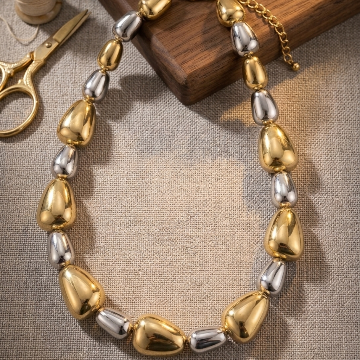 USE CODE: LOVE10Sculptural, organic, and effortlessly luxurious — the Sona Rupa Teardrop Nugget Necklace draws inspiration from raw natural forms, reimagined in a rich dual-tone finish. Large, rounded teardrop and oval nugget beads alternate between a warm brushed gold and a cool pearl-lustre tone, graduating in size from the clasp to the centre for a beautifully balanced silhouette. Each bead has a plump, hand-sculpted feel that gives the necklace a sense of weight and presence without being uncomfortable. The adjustable gold chain closure adds a refined finish. This necklace is equally stunning over an ivory wedding lehenga, a bold saree blouse, or a minimal linen dress. A truly versatile heirloom-quality piece for the modern Indian woman.