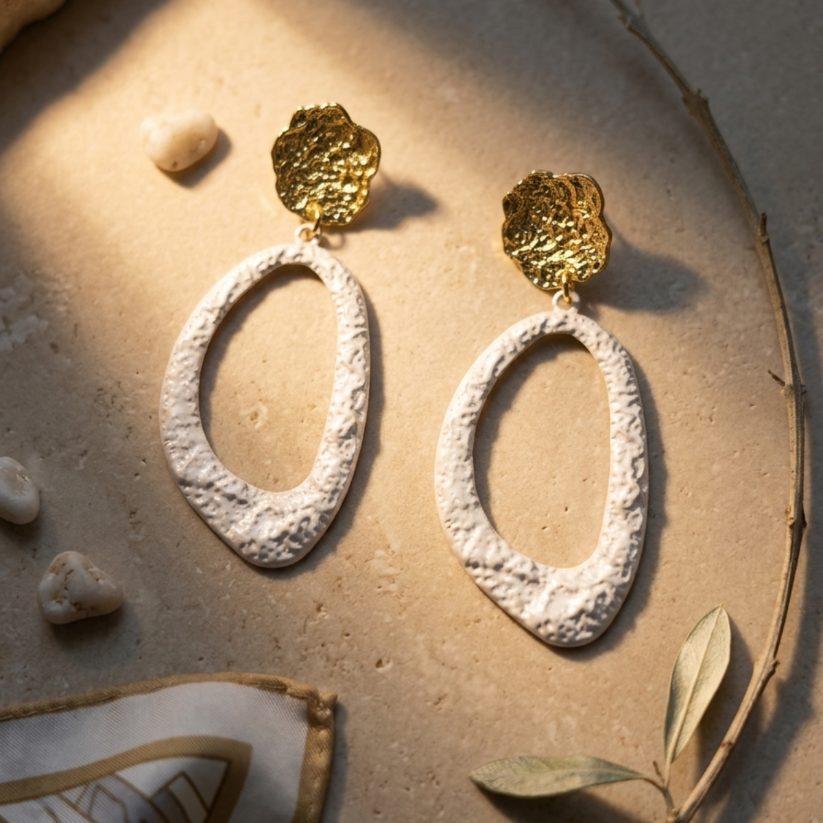 USE CODE: LOVE10Two contrasting worlds, one extraordinary earring. The Sona Rupa Oval Loop Drop Earrings open with a compact, deeply textured gold floral cluster stud — its surface etched with intricate granular detail — from which hangs a large, open oval loop in a hammered silver finish. The oval's irregular, hand-worked surface catches light in broken, organic patterns, giving it the look of beaten precious metal and a texture that is completely distinct from the warm gold of the stud above. Together they create a conversation between two finishes, two tones, and two design vocabularies — and somehow, they are perfect together. Large enough to be a statement, light enough to be comfortable. These earrings pair brilliantly with minimal outfits that let the jewellery lead — a plain silk kurta, a clean white blouse, a monochrome lehenga set.