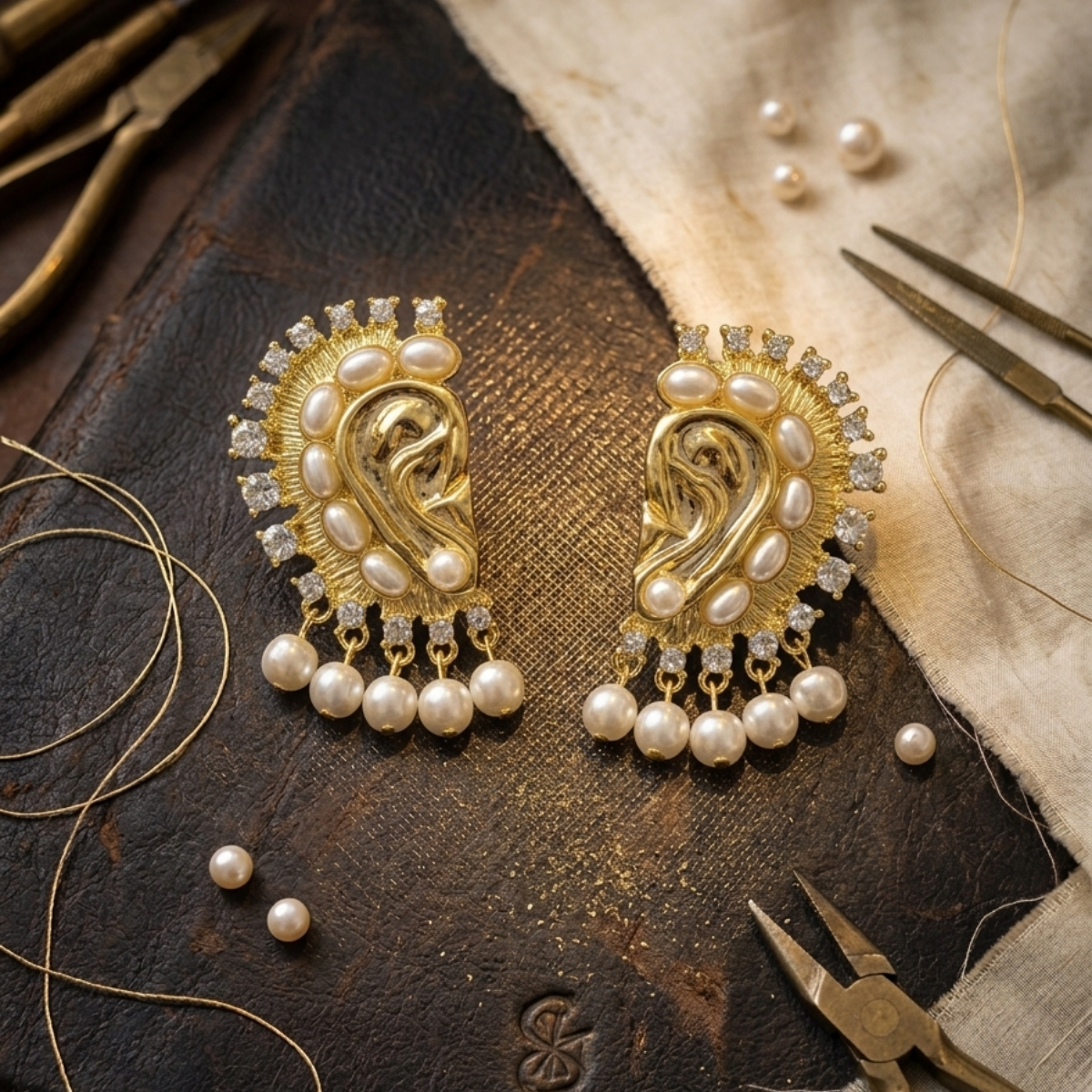 USE CODE: LOVE10Rooted in centuries of Indian jewellery tradition, reimagined for the modern bride. The Sona Rupa Paisley Pearl Chandelier Earrings are one of the most exquisite pieces in the collection. A large gold paisley motif forms the base — its surface embossed with flowing relief work reminiscent of traditional meenakari and kundan craftsmanship — bordered by a halo of oval freshwater pearls and framed with sparkling CZ stones along the outer edge. From the base of the paisley, a fringe of five delicate freshwater baroque pearl drops sways with graceful movement. These earrings are the definition of bridal elegance — made for nikah ceremonies, Hindu weddings, reception nights, and engagement functions. They pair effortlessly with red, ivory, or gold bridal ensembles.