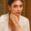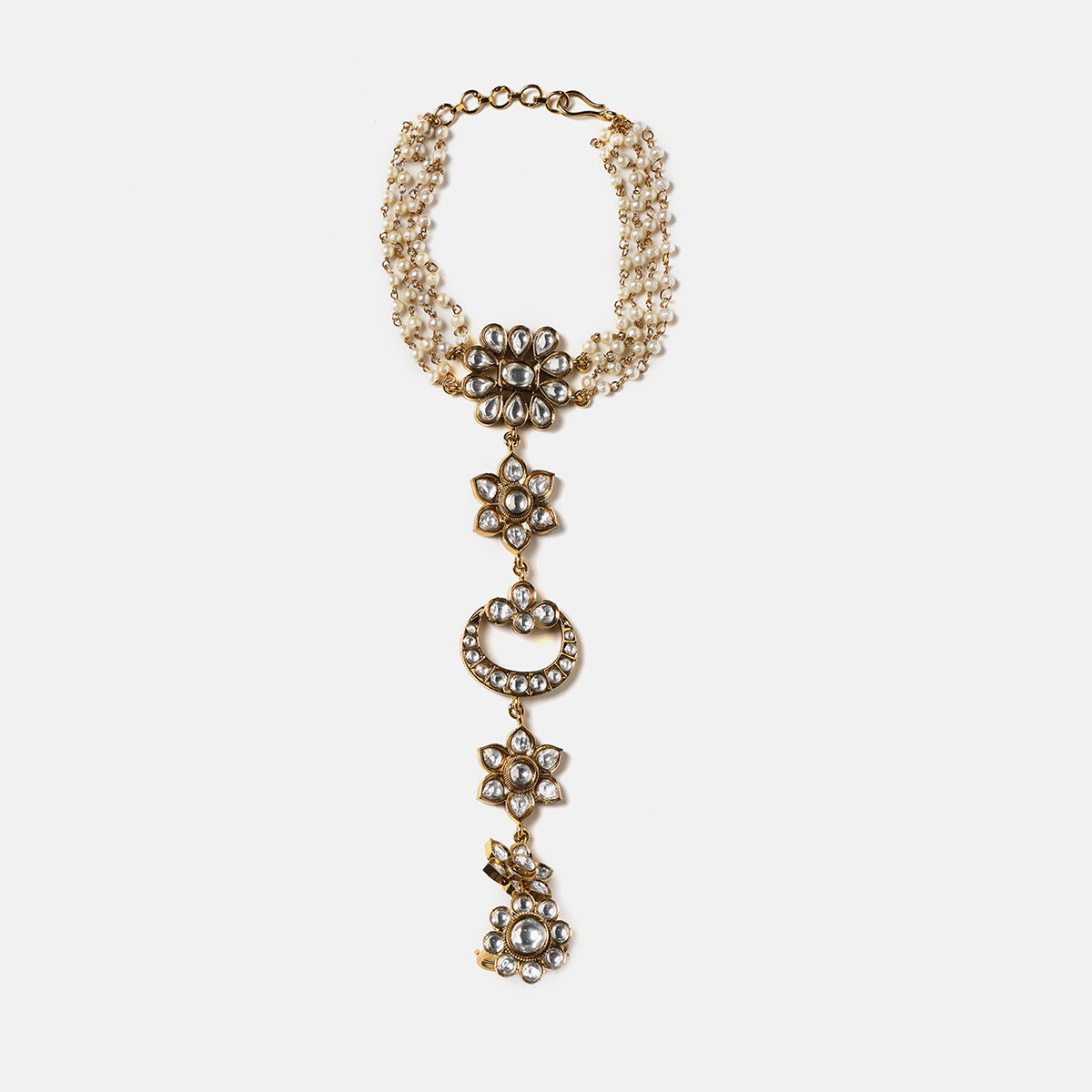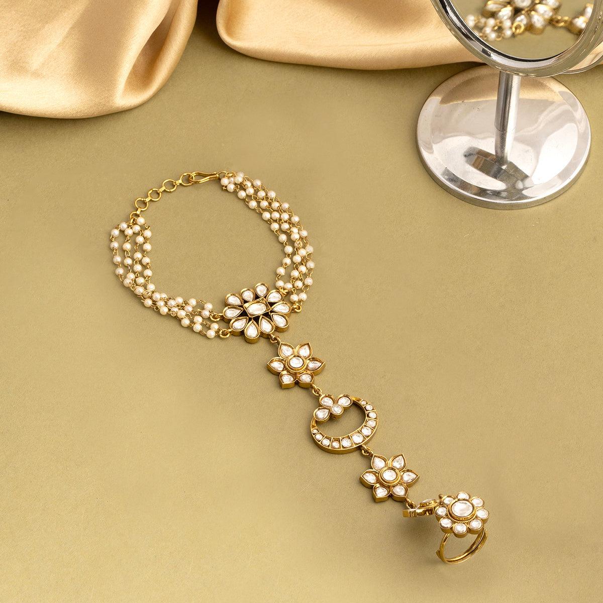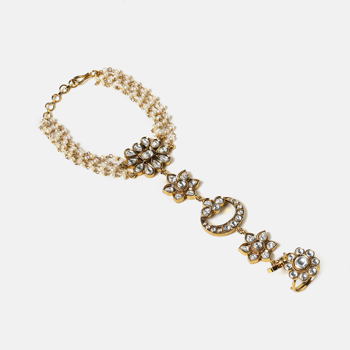 USE CODE: LOVE10Crafted in classic kundan style, it features delicate floral motifs set with shimmering stones that flow seamlessly from the ring to the wrist. The soft pearl detailing with the gold-toned finish