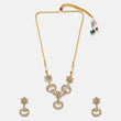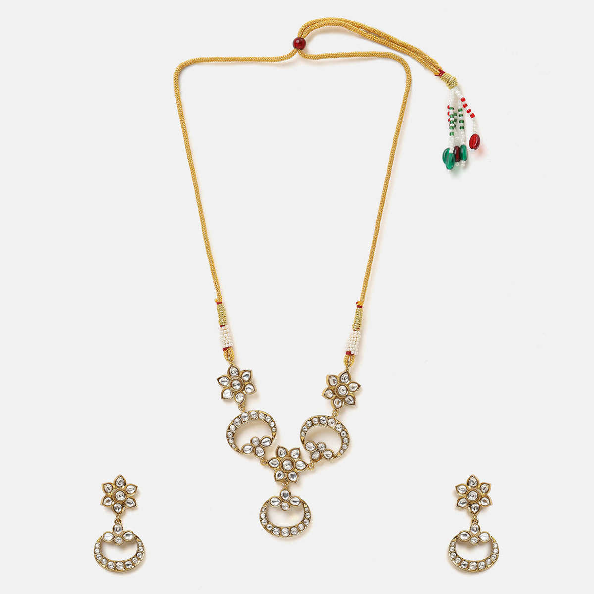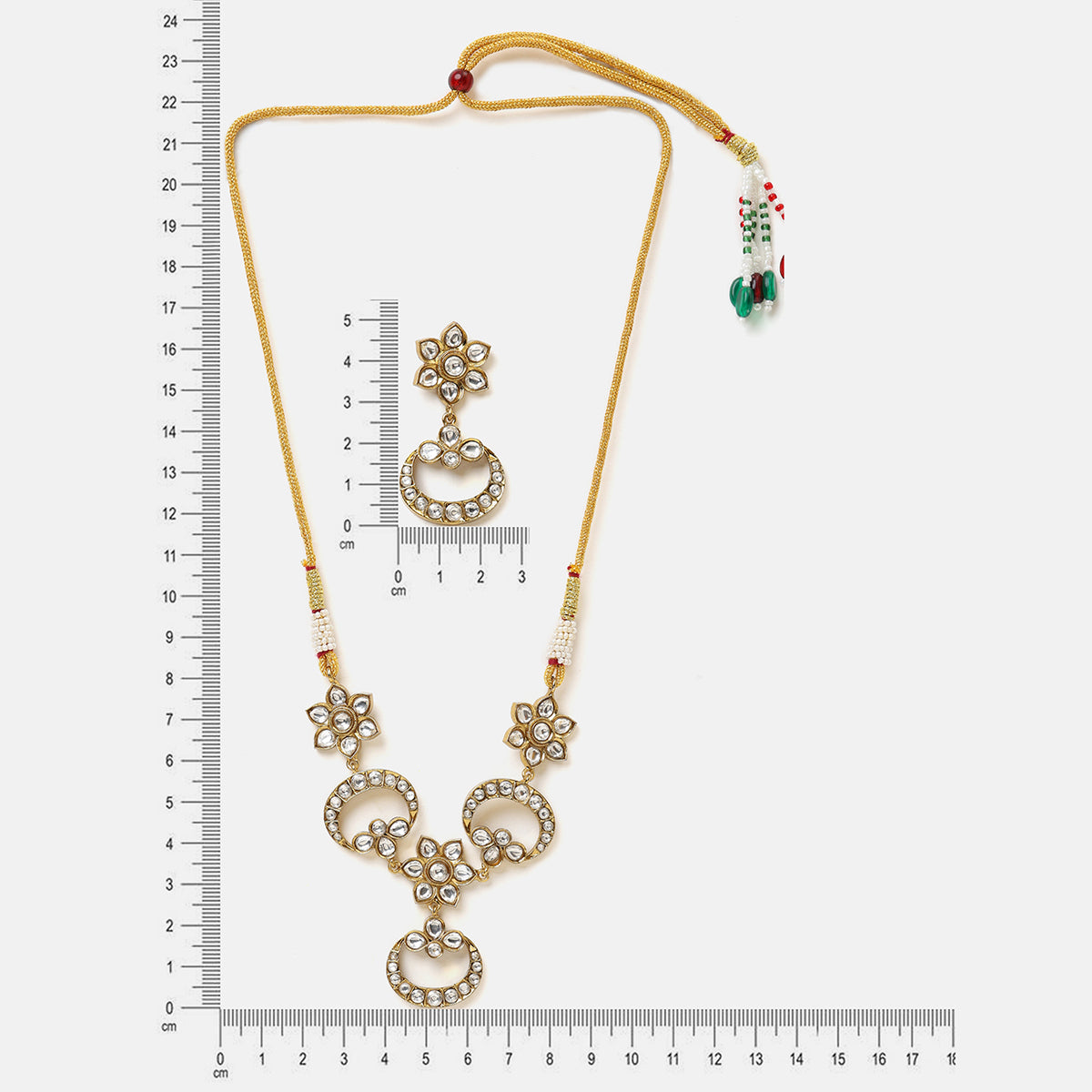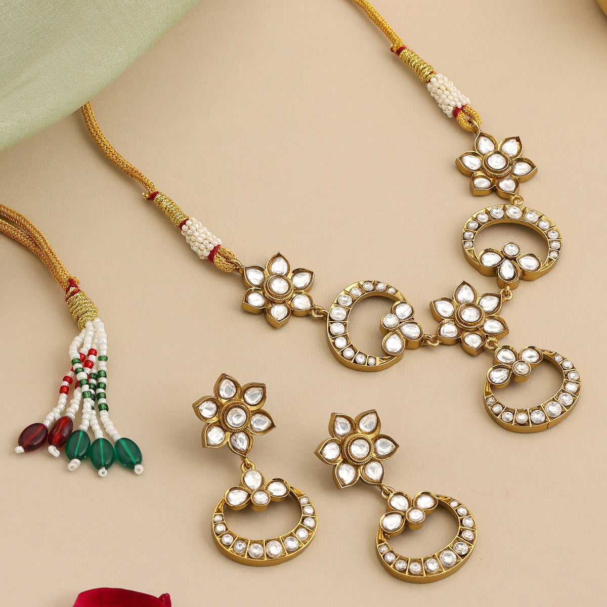 USE CODE: LOVE10This piece completely speaks for its beauty as it is handcrafted with attention to detail. This necklace and matching earrings are in a warm gold finish. It’s a piece that doesn't just catch the light but it also captures memories. The subtle glow of the uncut diamonds complements all outfits, ensuring you stand out with elegance and an authentic, individual style.