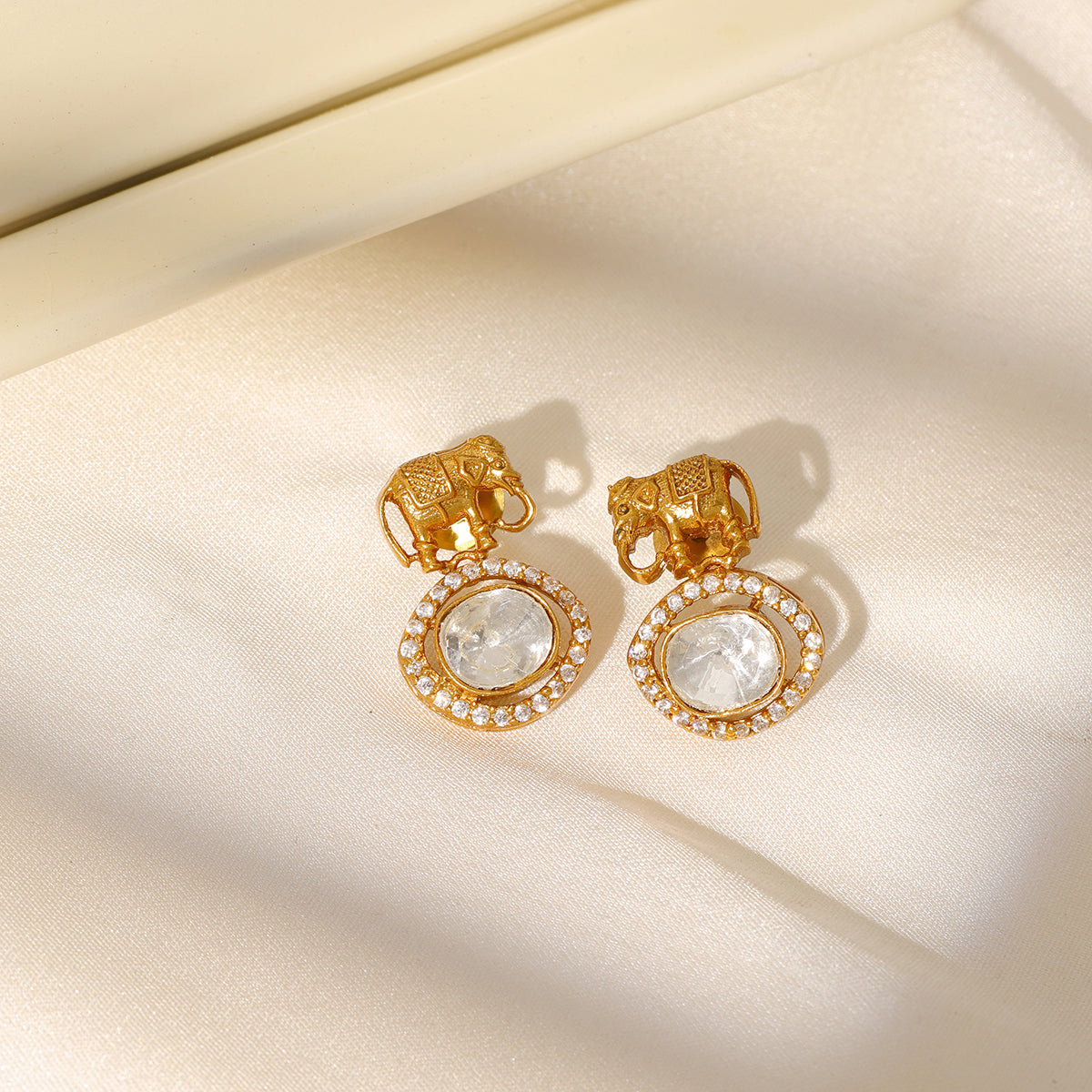 USE CODE: LOVE30Experience the timeless elegance and captivating beauty of this handcrafted masterpiece of earring staring elephant studs with kundan drop earrings. Each detail is meticulously crafted, ensuring that these earrings become a timeless addition to your jewelry collection. The intricate patterns and delicate craftsmanship make them a true work of art, reflecting the rich heritage of Indian jewelry.