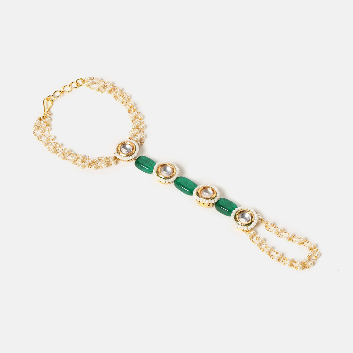 USE CODE: LOVE10A hand that tell a story, this is a celebration of detail, balance, and hardwork of the women who have handcrafted these with love and patience.Soft pearl strands flow gracefully from finger to wrist, creating a delicate base for the striking green stone accents that run through the centre