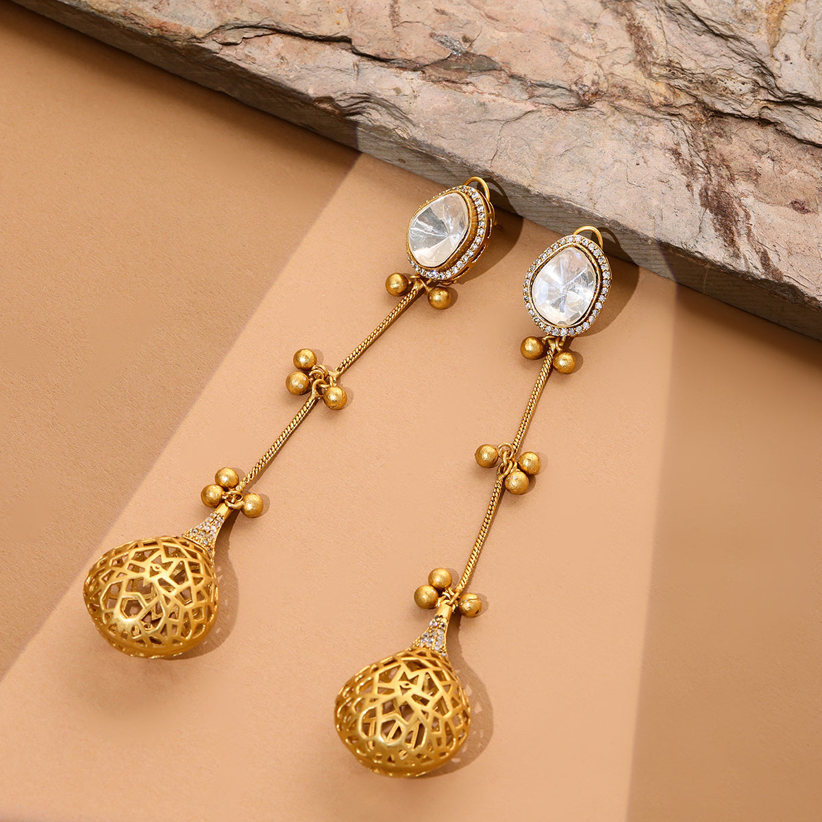 Wear these with a flowy kurta set or lehenga in warm, contrasting tones like mustard or maroon. Let your hair down in soft waves or a low bun to highlight the earrings’ vertical elegance.