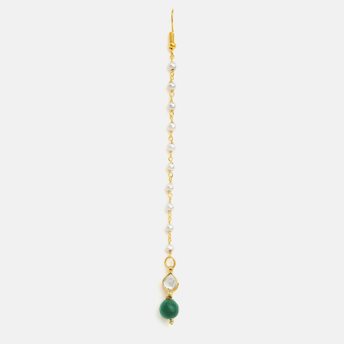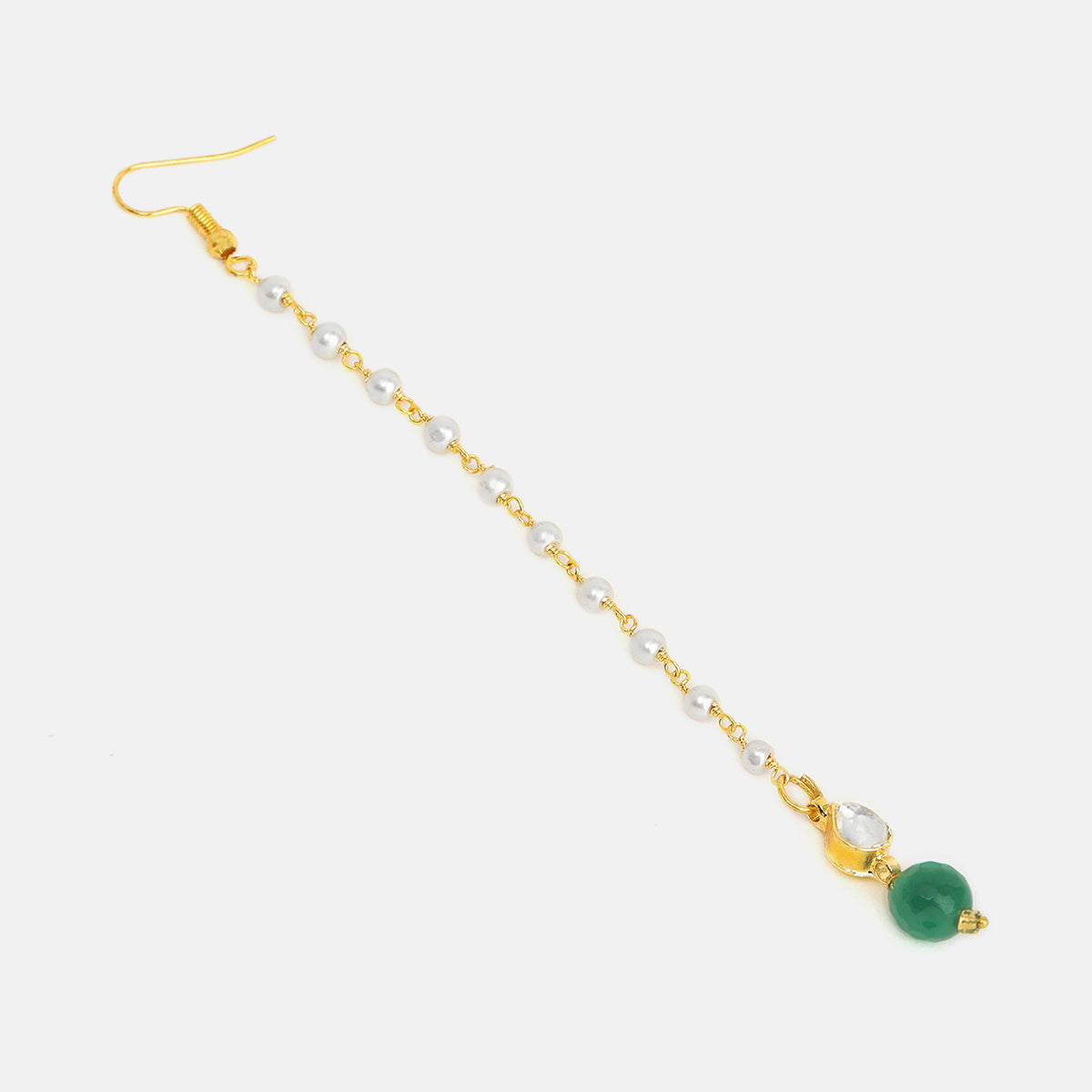 USE CODE: LOVE10Delicate by design and meaningful at heart, this maang tikka is a quiet celebration of tradition. A fine line of soft pearls and at the centre rests a single green drop, gently suspended, adding a fresh pop of colour that feels calm. The design is intentionally minimal—crafted to enhance your features rather than overpower them. The design is intentionally minimal—crafted to enhance your features rather than overpower them.