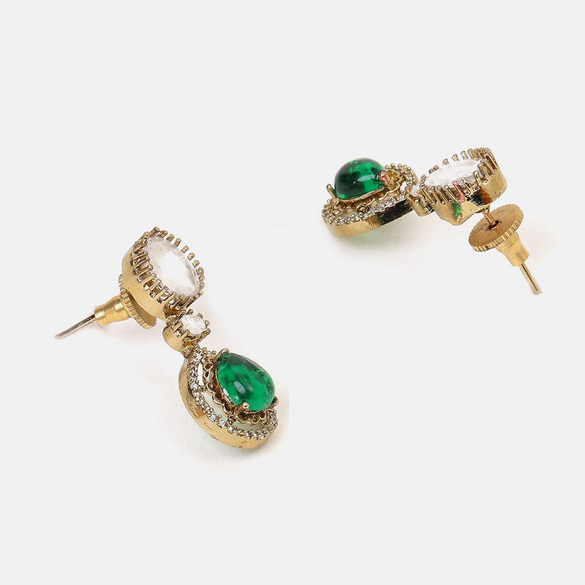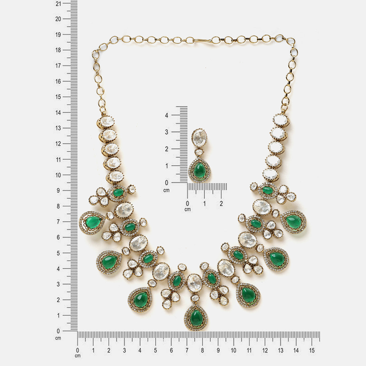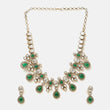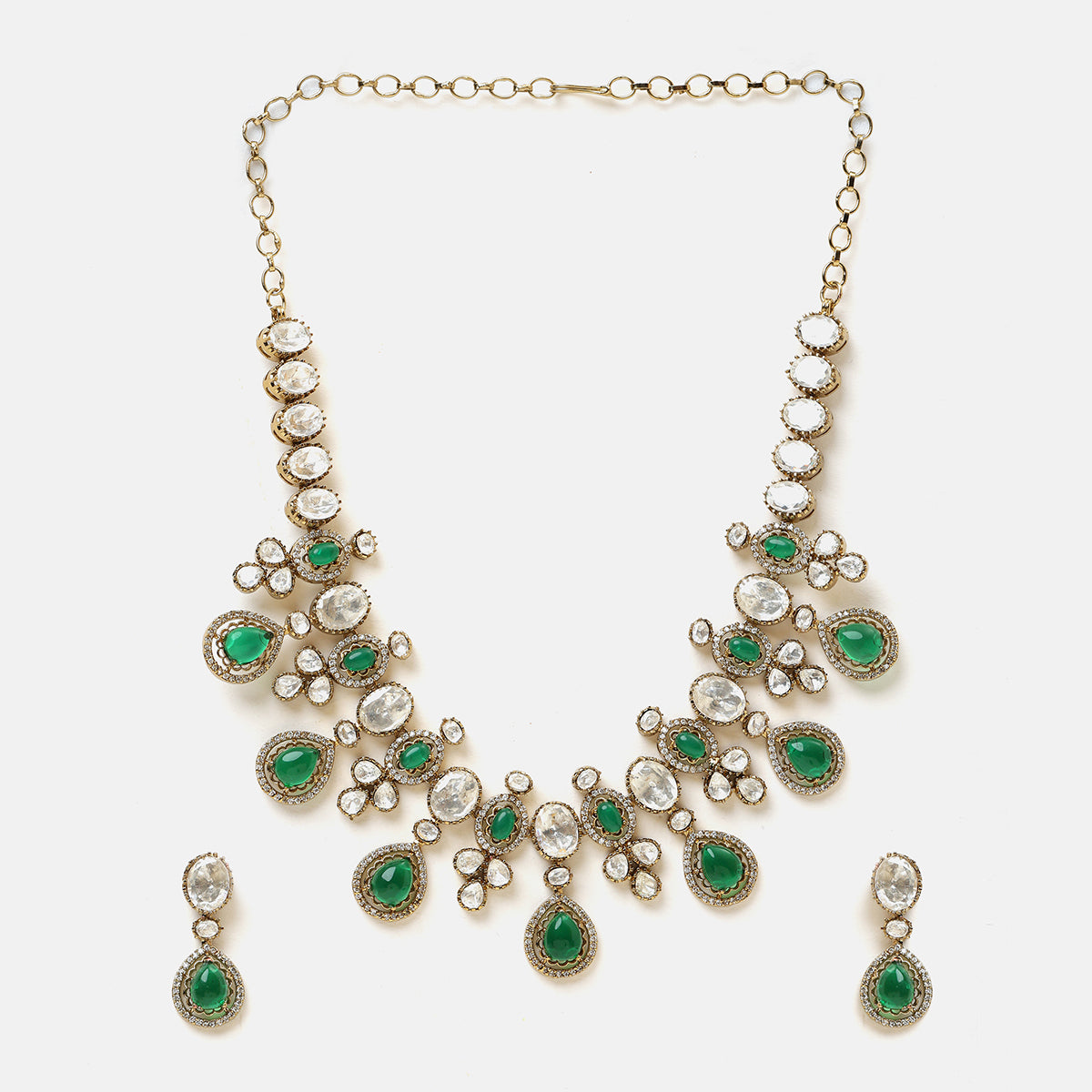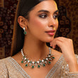 USE CODE: LOVE10This piece is part of our Collection of Chandni, inspired by the soft glow of moonlight and the many ways it reflects in the night sky.Set with rich green stones framed by shimmering white accents, the necklace flows beautifully along the neckline, the matching earrings echo the same chand-inspired design, adding a soft glow to the face and completing the look effortlessly.This jewellery that doesn’t just adorn you—it stays with you, like moonlight lingering long after the night has passed.