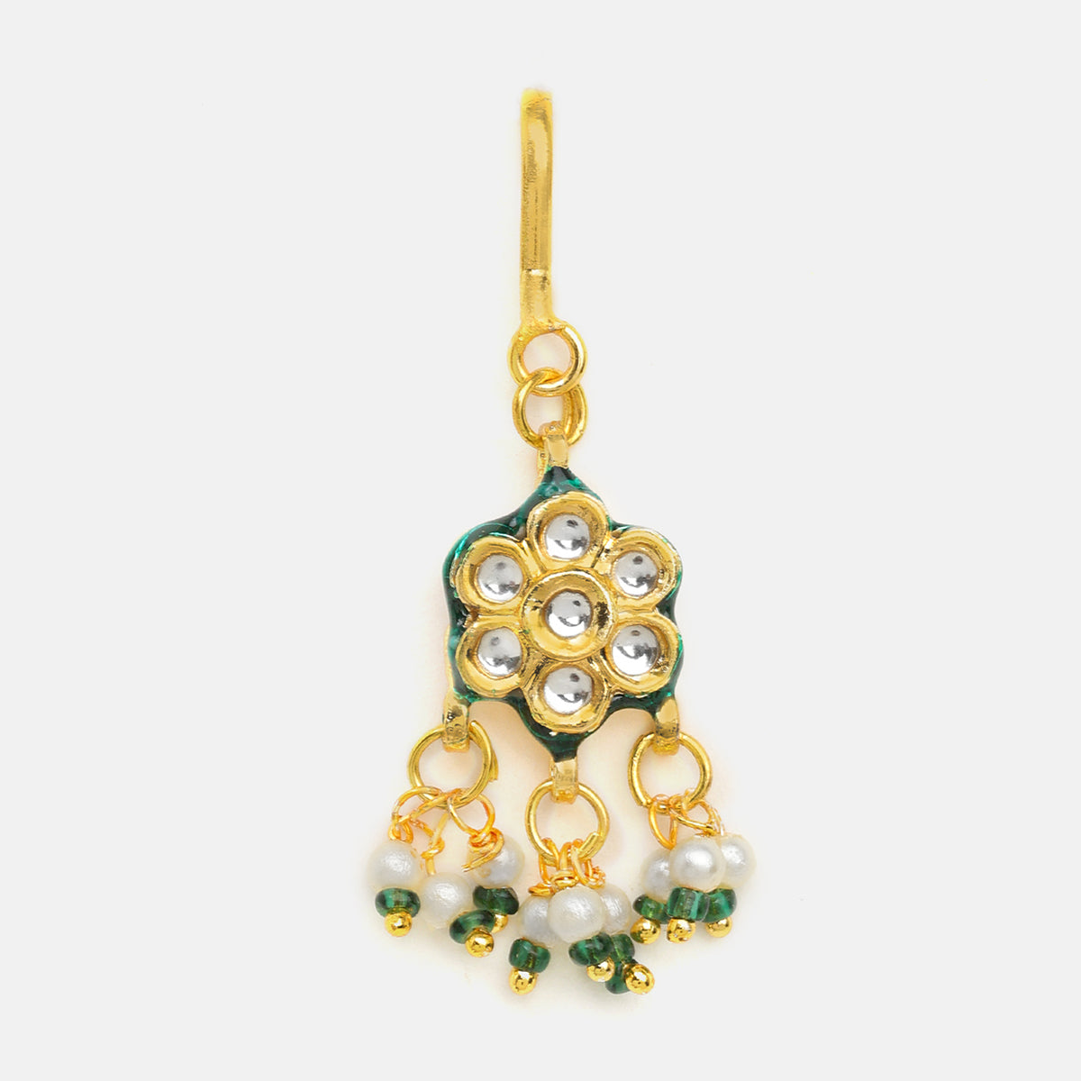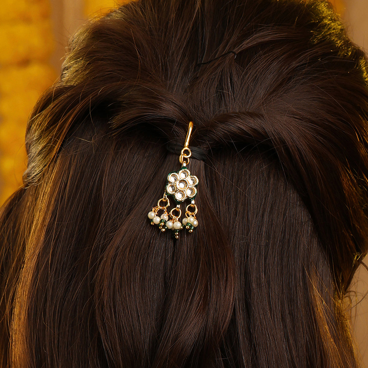 USE CODE: LOVE10Charming hair pin is a beautiful blend of simplicity and traditional elegance. Designed with a delicate floral motif at the centre and a soft pearl detailing framed in a warm gold finish, creating a look that feels graceful and timeless.Tiny bead accents hang gently below the floral design, adding subtle movement and a touch of sparkle without overpowering your hairstyle. Whether you’re attending a family function, festive celebration, or intimate wedding event, this piece adds just the right amount of charm and elegance to complete your look.