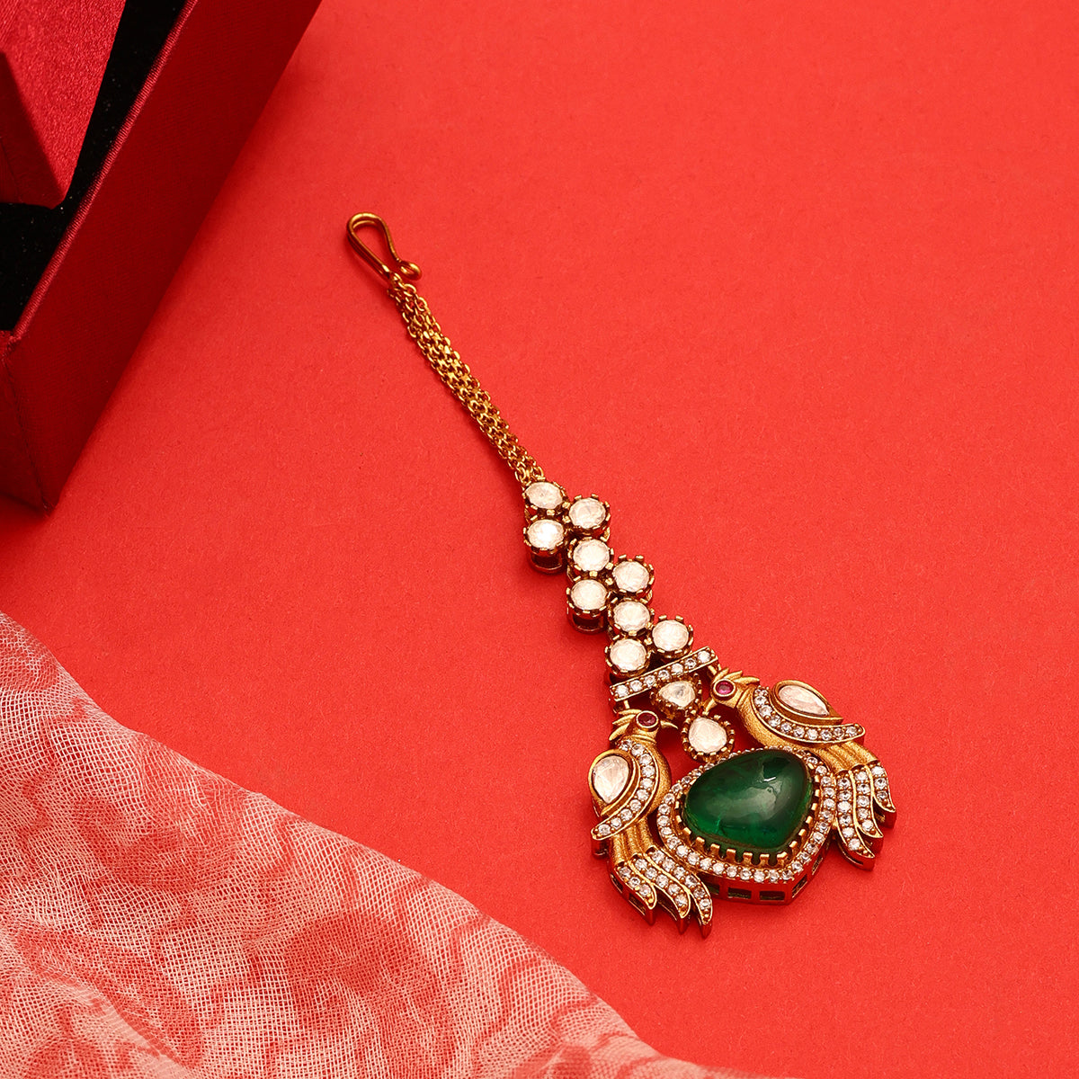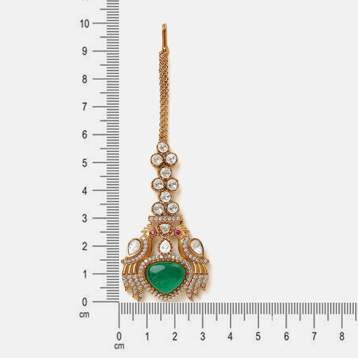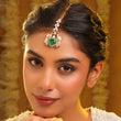 USE CODE: LOVE10The piece features Kundan work and a prominent heart-shaped emerald drop centerpiece. It is adorned with sparkling stones and delicate pearl embellishments. The ornate design is ideal for weddings, festive occasions, and cultural events, radiating a timeless charm that elevates traditional ensembles.