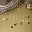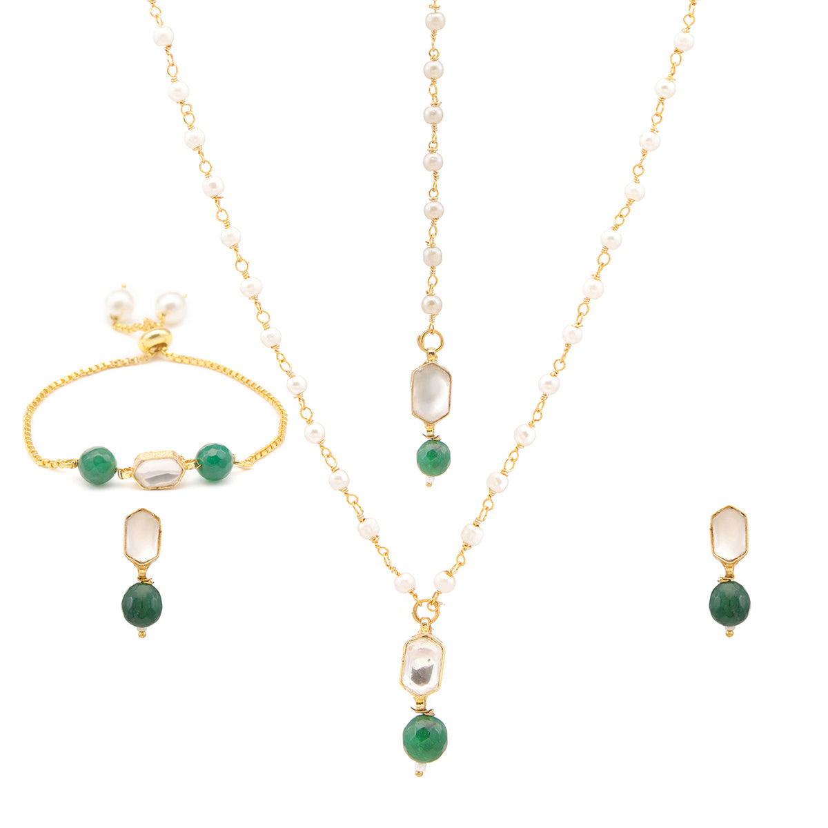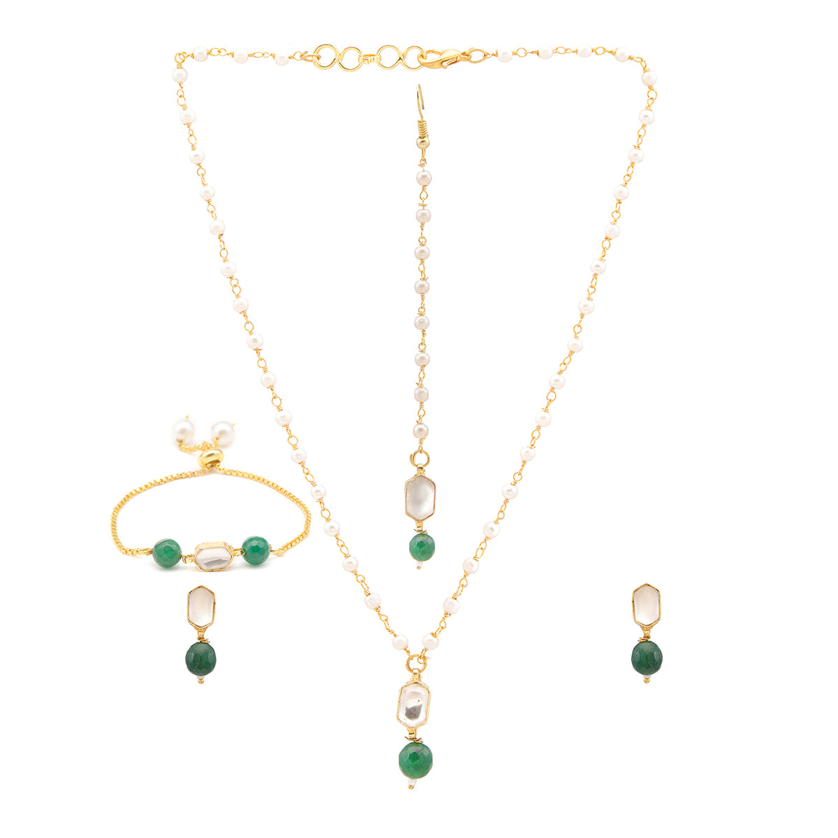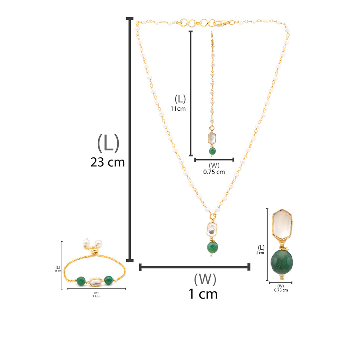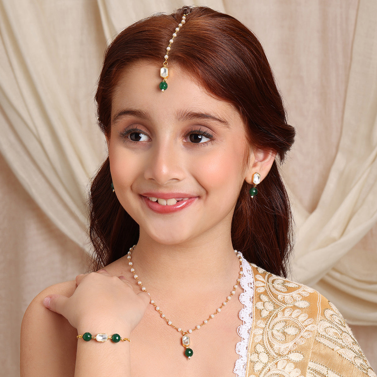Ruby Raang Kids Kundan Green Stone Jewelry Set in Gold Plated Brass with Pearls