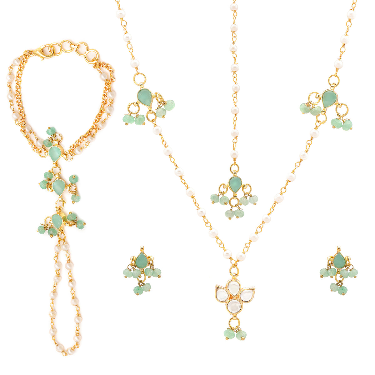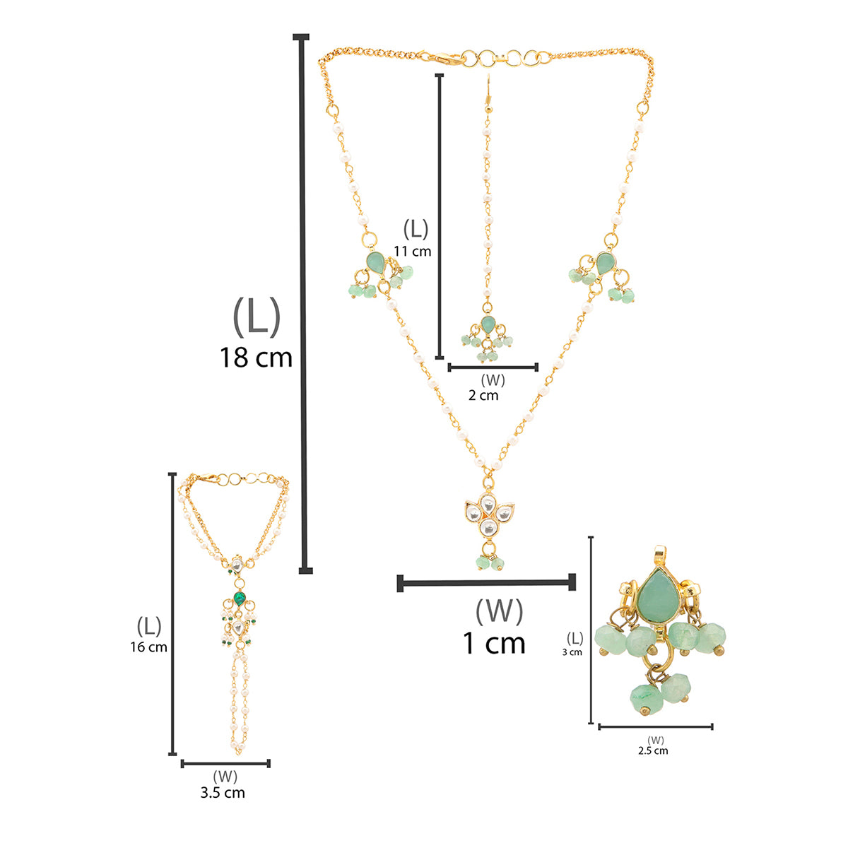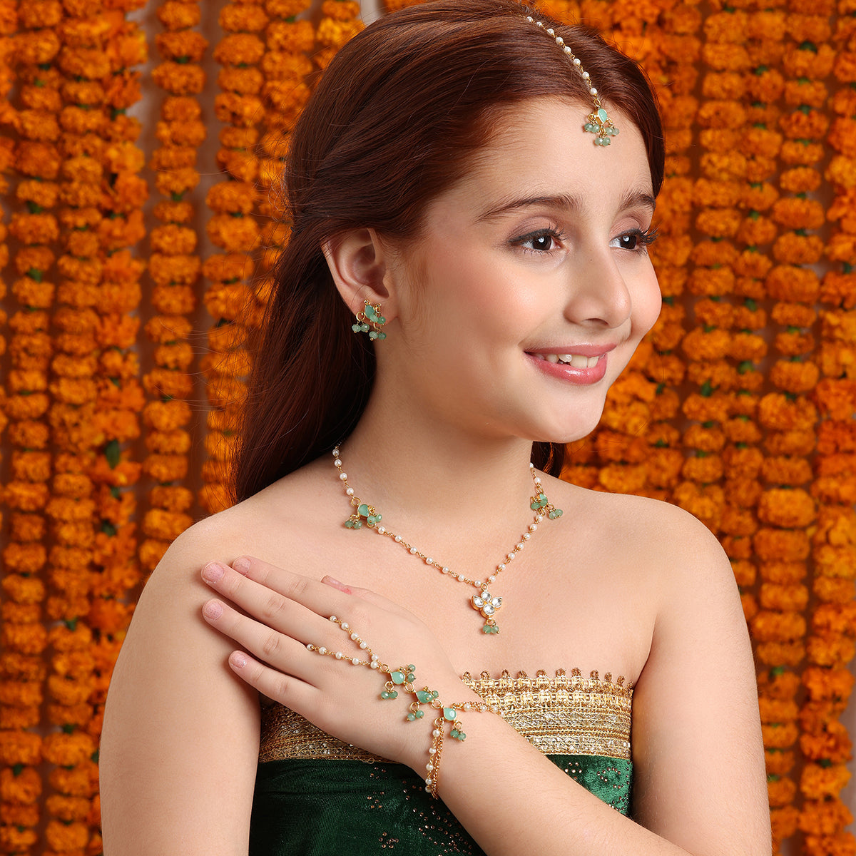 Ruby Raang Kids Kundan Mint Green Stone Jewelry Set in Gold Plated Brass with Pearls