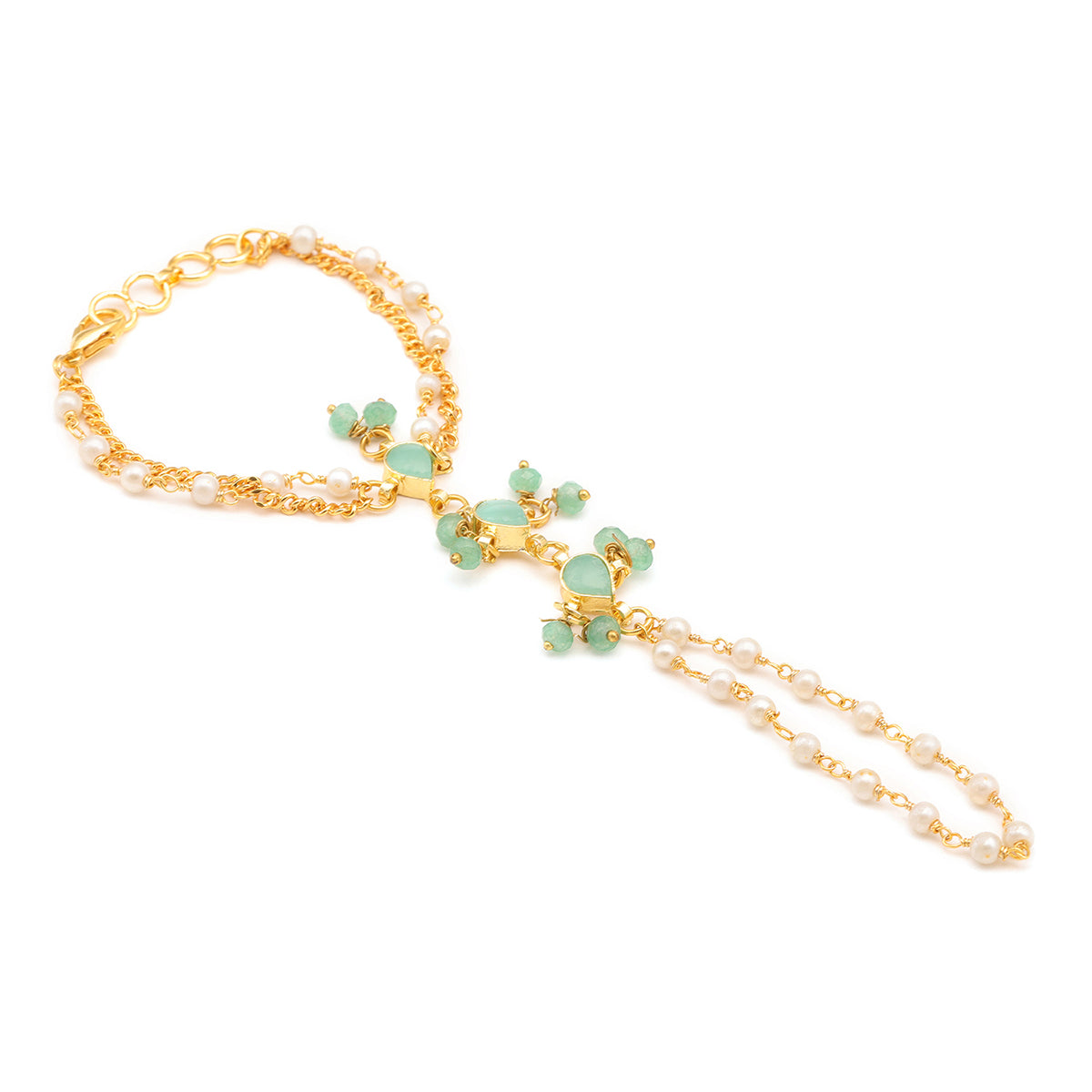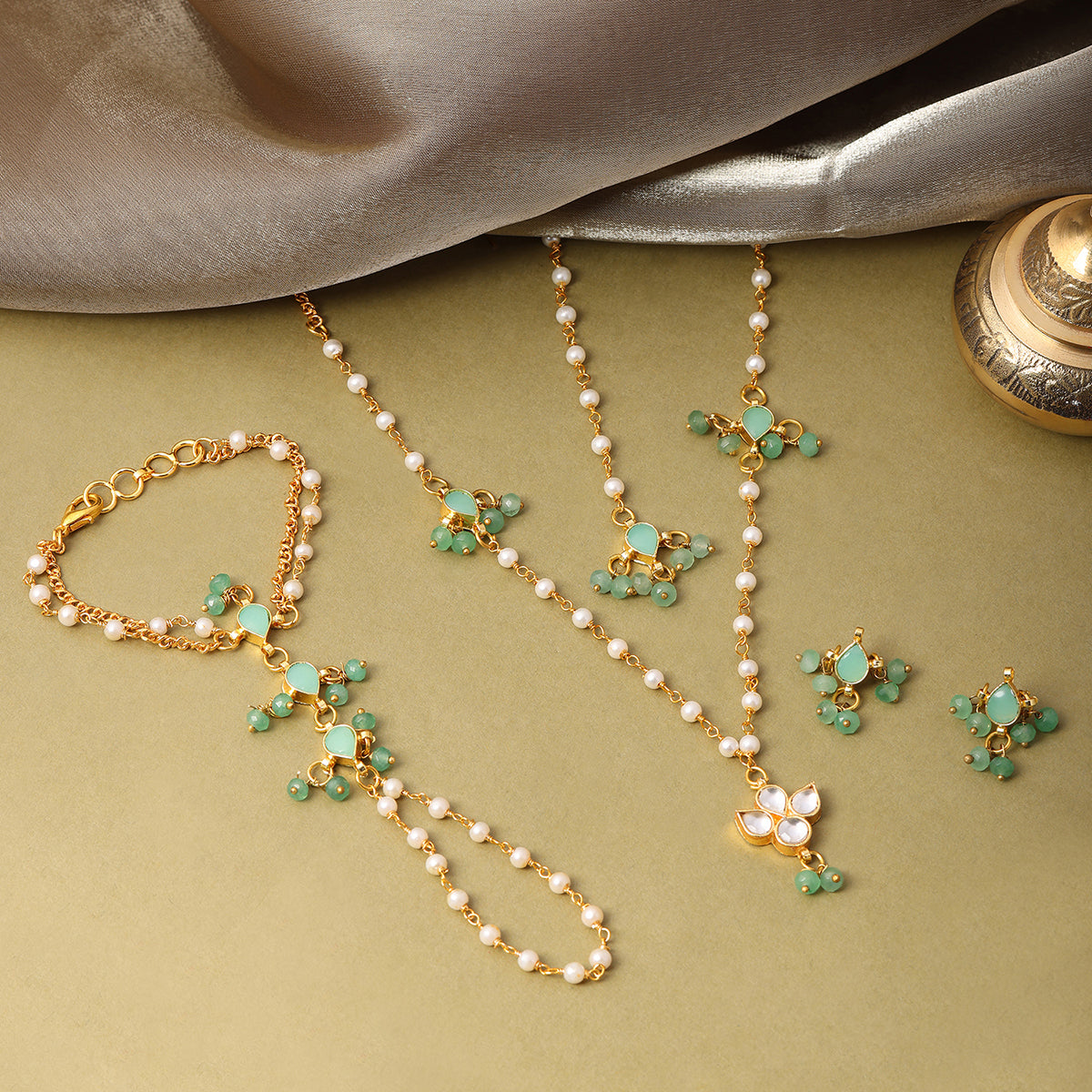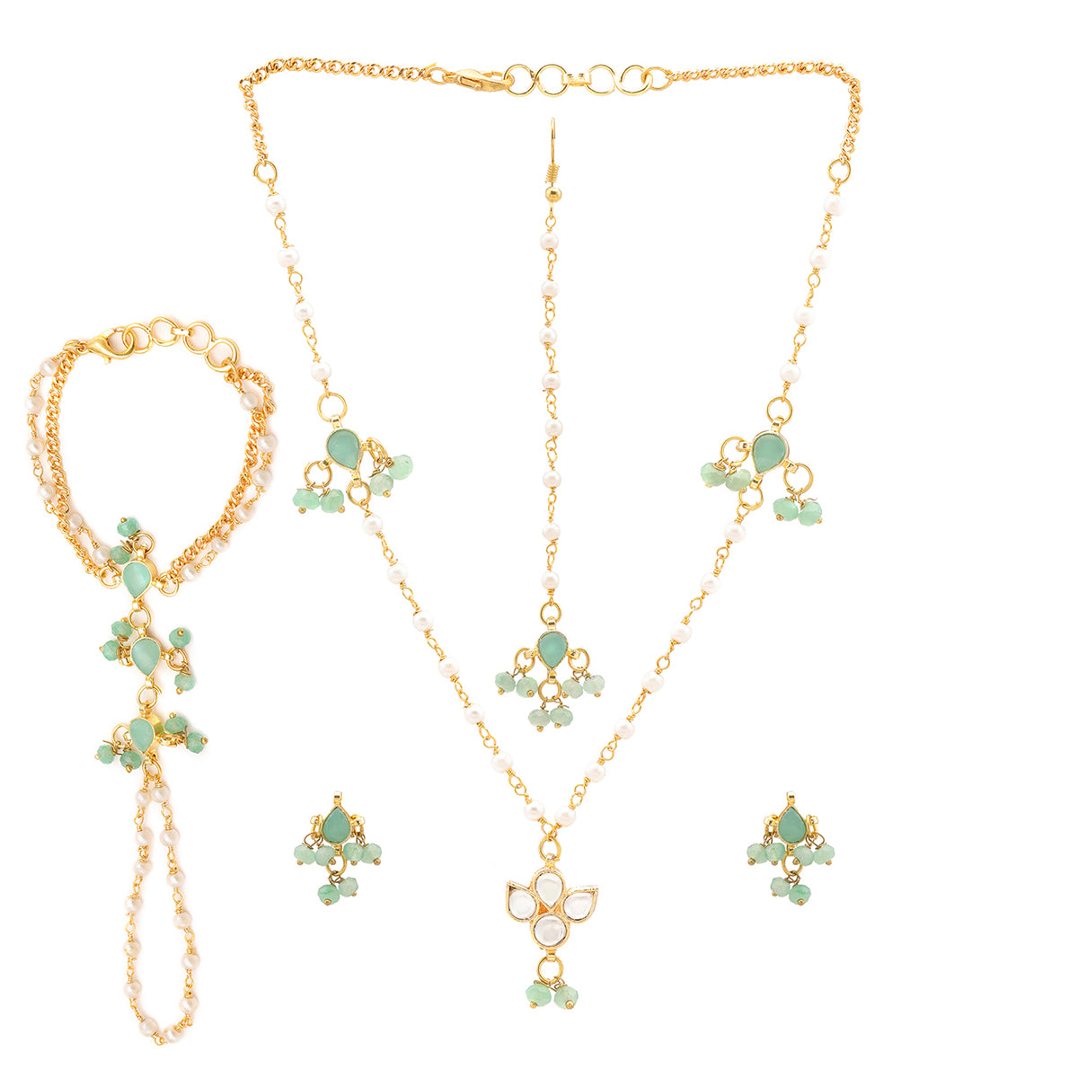 Ruby Raang Kids Kundan Mint Green Stone Jewelry Set in Gold Plated Brass with Pearls