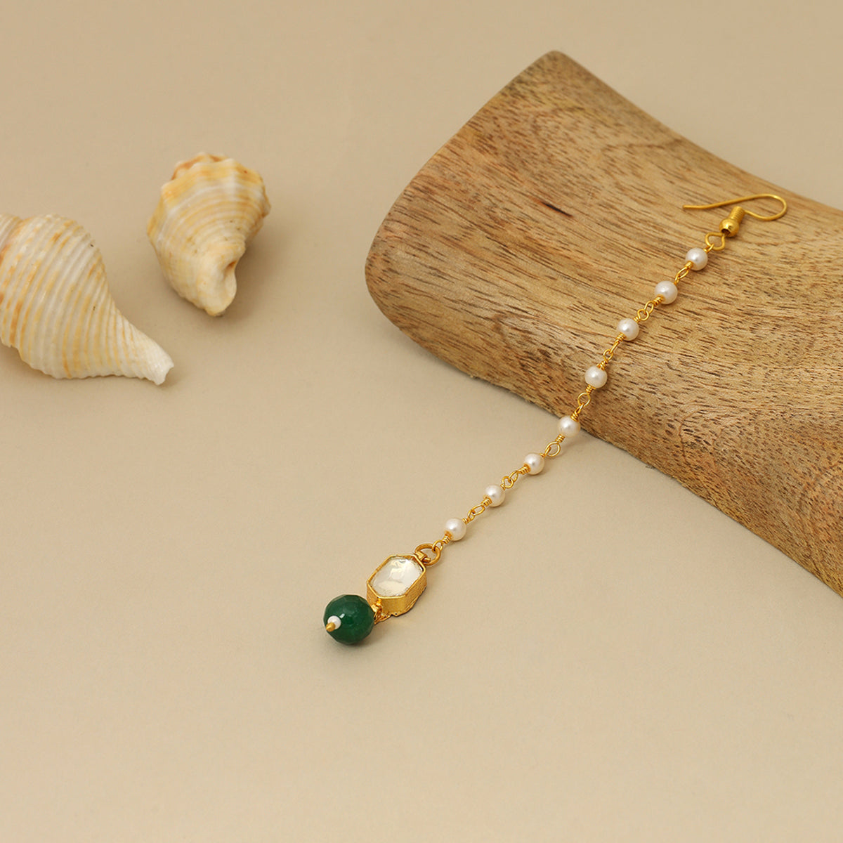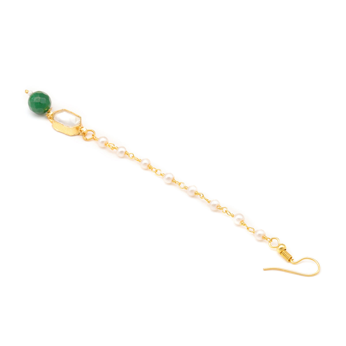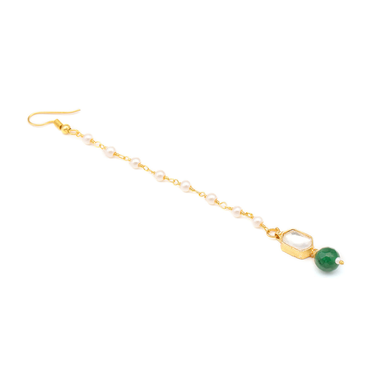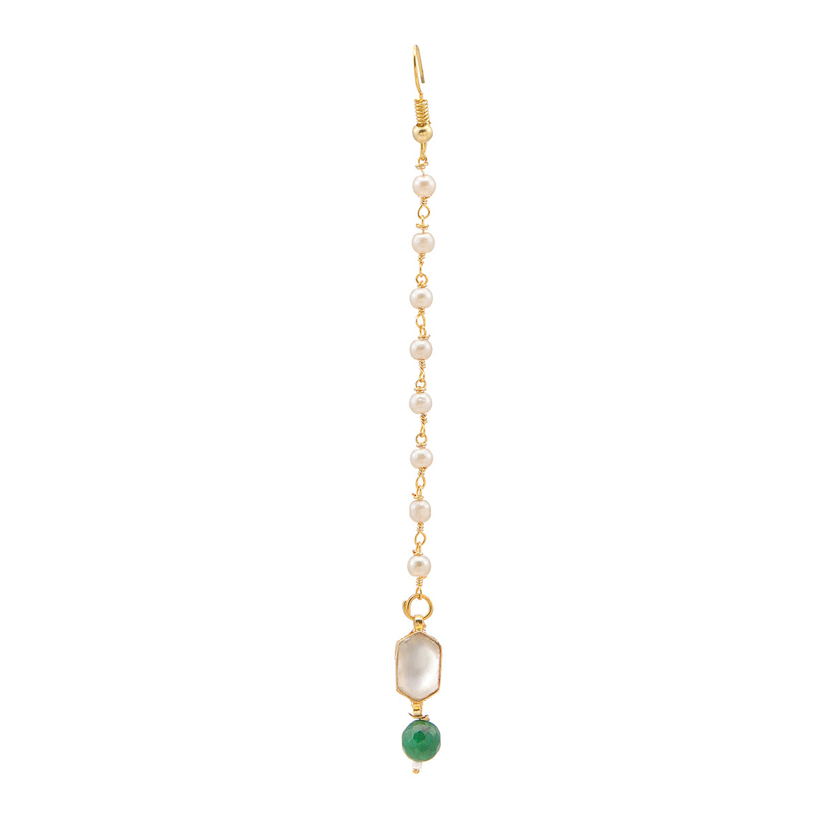 Ruby Raang Kids Maang Tikka with Green Drop and Pearls in Hexagon Shape Gold Plated Brass