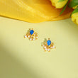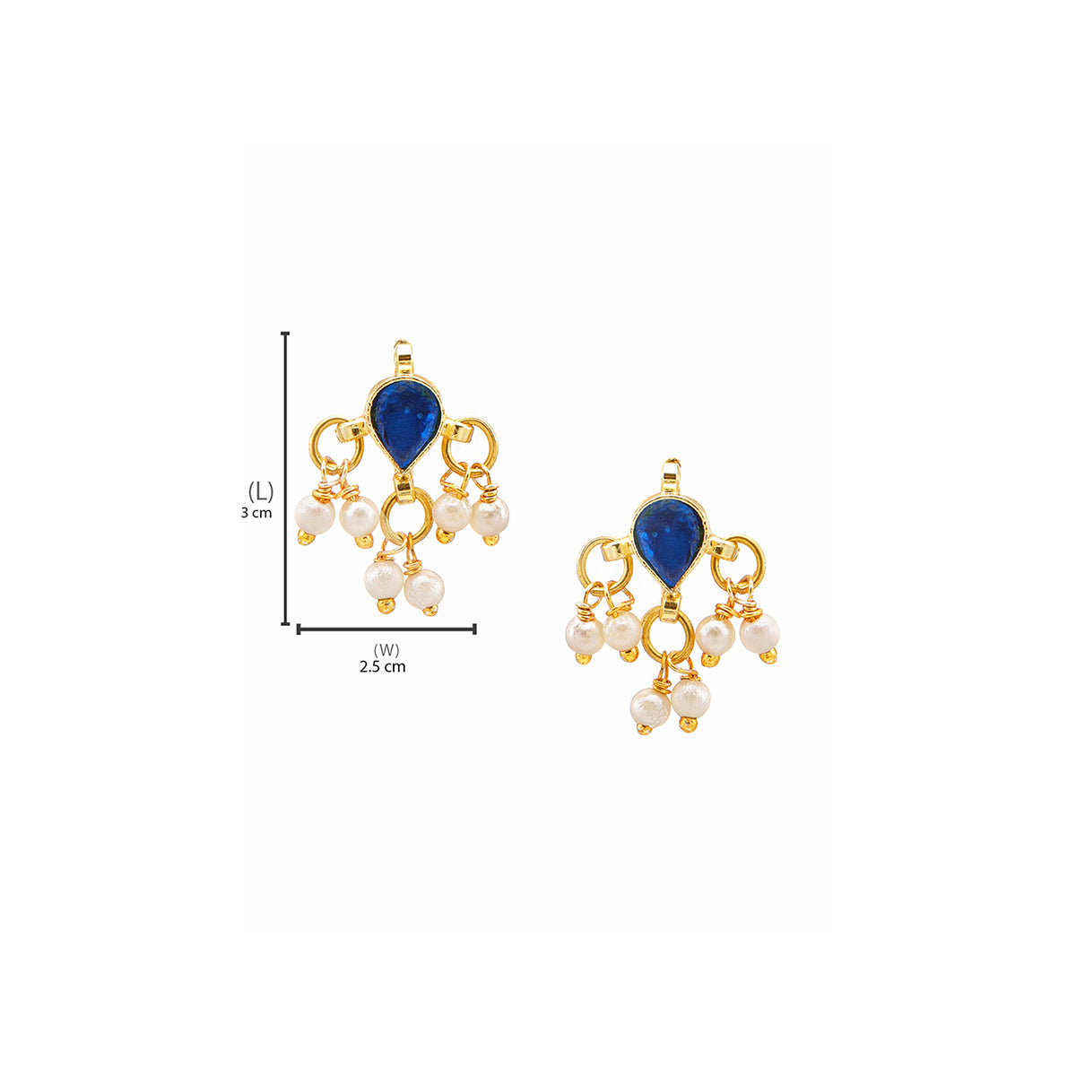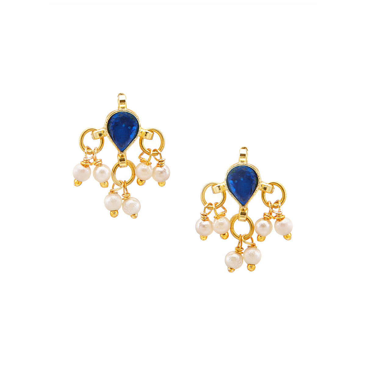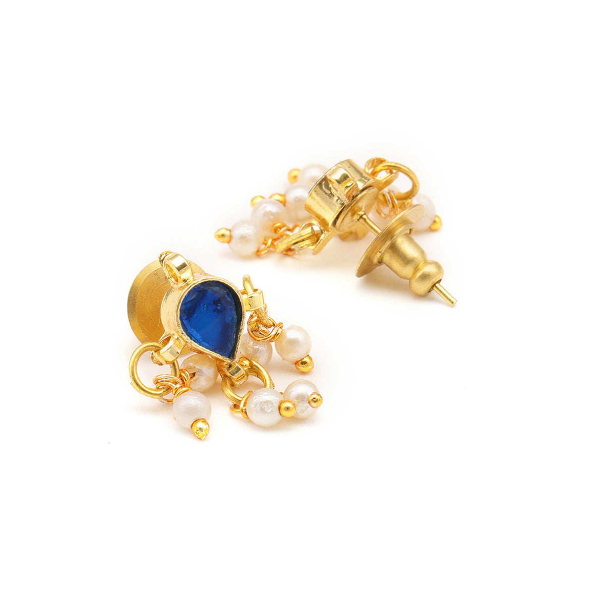 Ruby Raang Kids Tear Drop Shaped Kundan Studs Earrings in Blue Stone with Pearl Jhallar in Gold Plated Brass