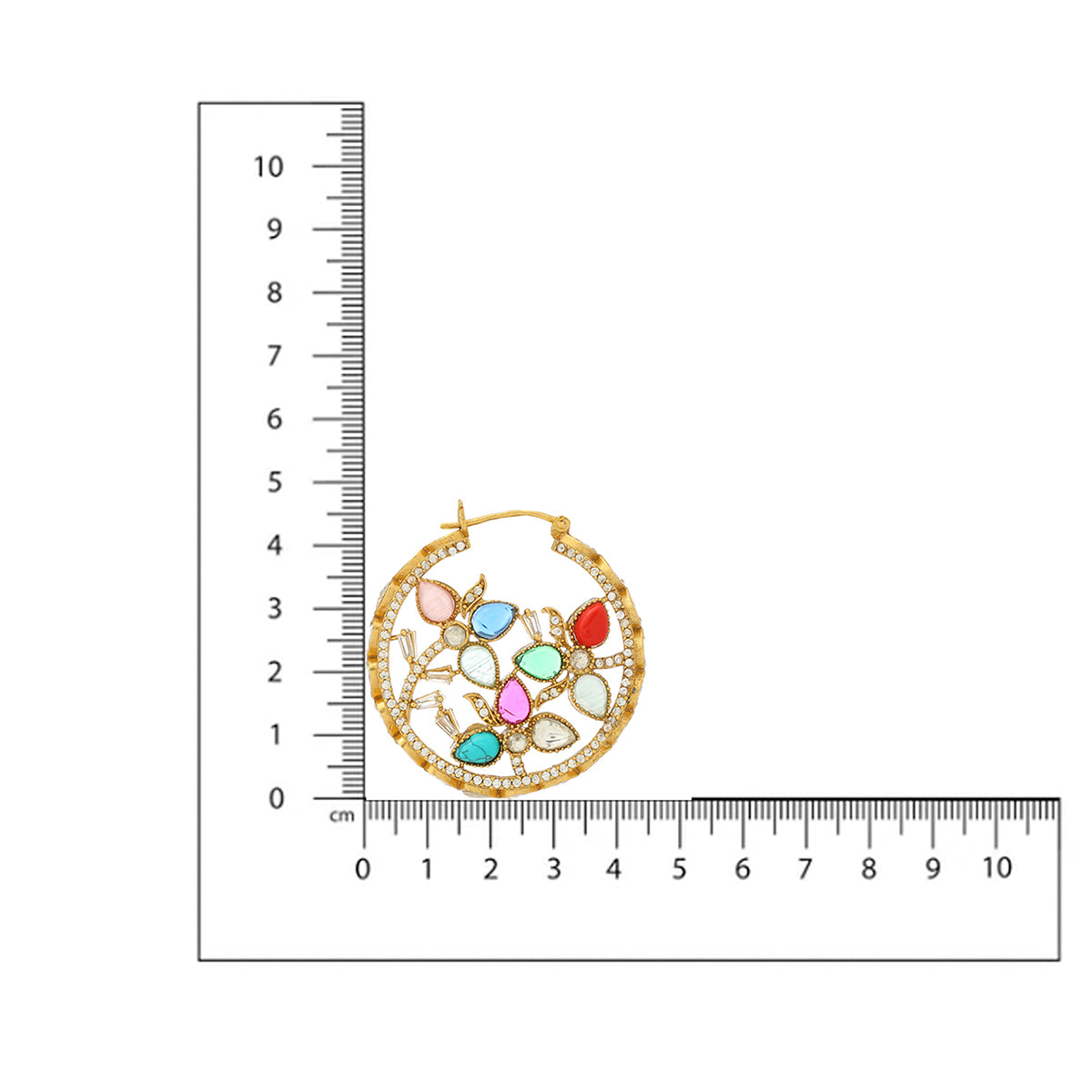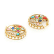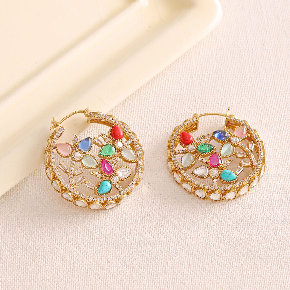 USE CODE: LOVE30These Navratan multicoloured round earrings are a vibrant celebration of tradition and elegance. Featuring nine auspicious gemstones each symbolizing cosmic energy set in a beautifully crafted circular design, they radiate color, culture, and charm. The intricate detailing and rich palette make them a standout accessory for festive occasions, weddings, or cultural events. Whether paired with Indian ethnic wear or fusion ensembles, these earrings add a bold, regal flair. Lightweight yet striking, they bring a perfect balance of heritage and style to your jewelry collection.