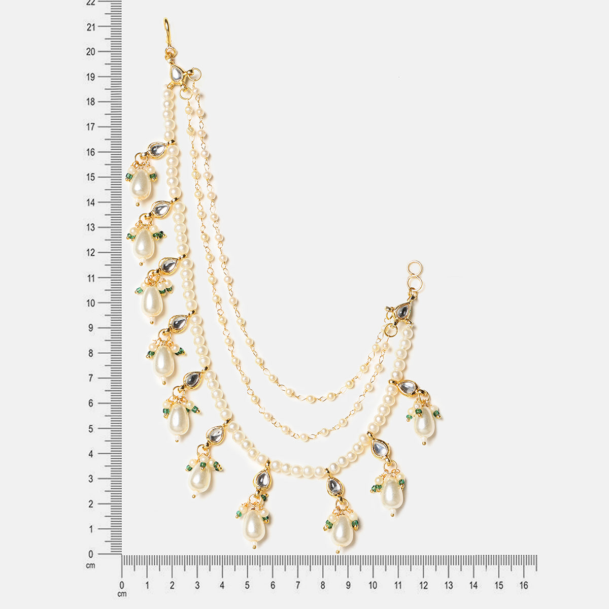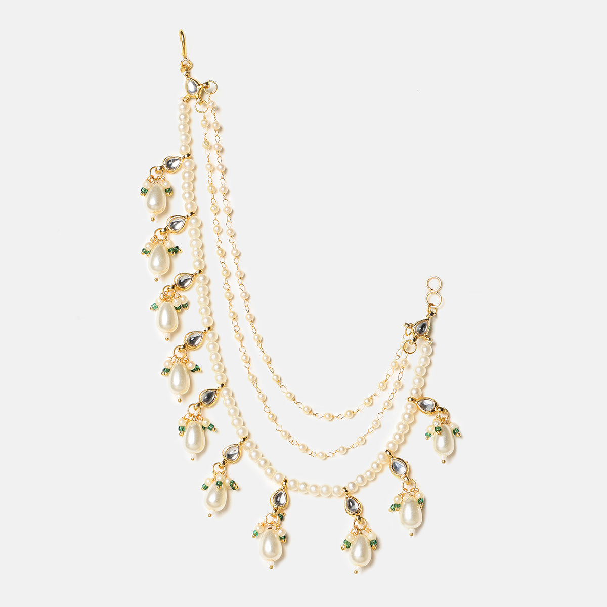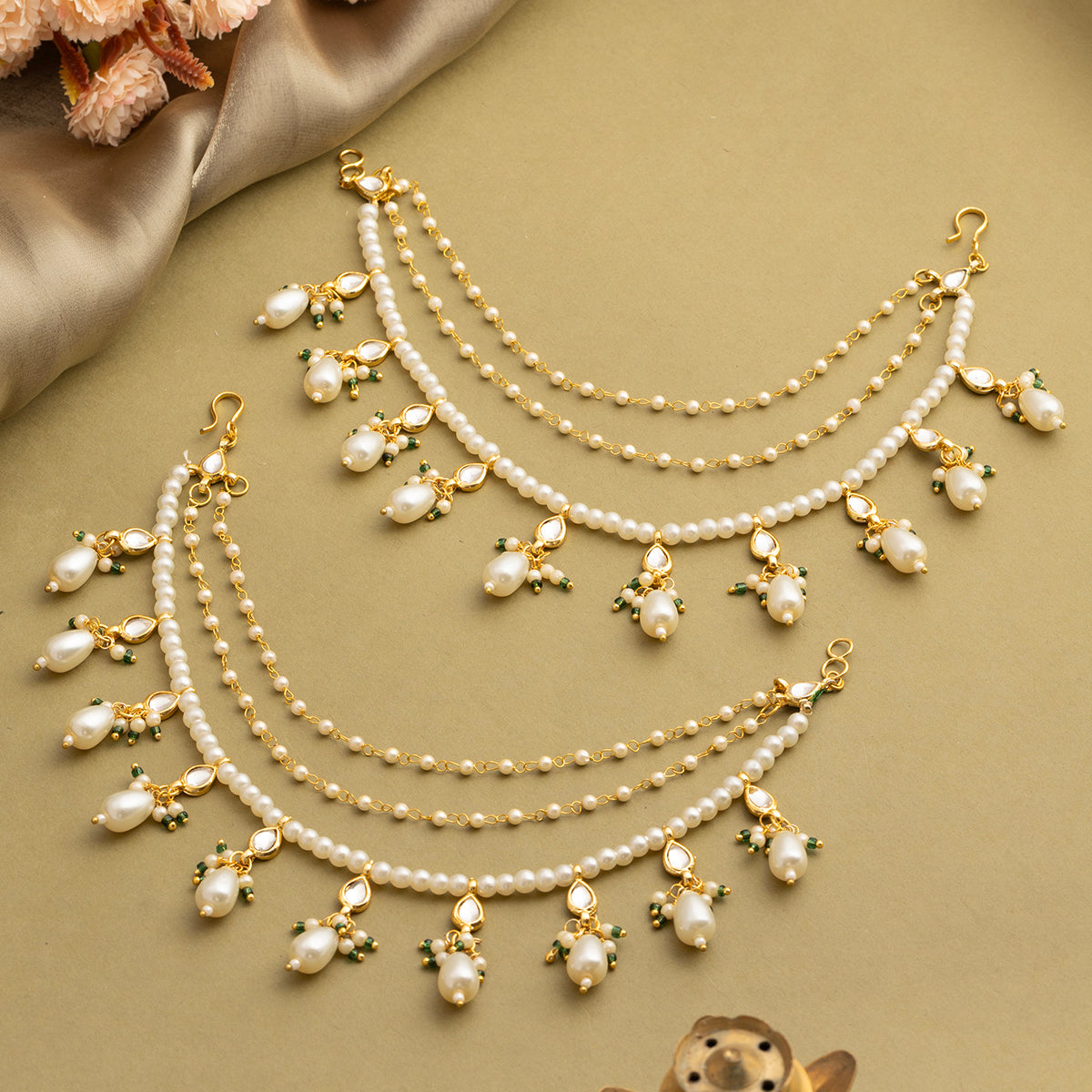 USE CODE: LOVE10This Kaan chain is a celebration of old-world charm and delicate beauty, handcrafted for women who love to wear their traditions with quiet confidence. Designed to flow effortlessly from the ear to the hair, this piece feels less like an accessory and more like a graceful extension of your look. What truly sets this piece apart is its handcrafted soul. Ideal for weddings, mehndi functions, and festive gatherings.