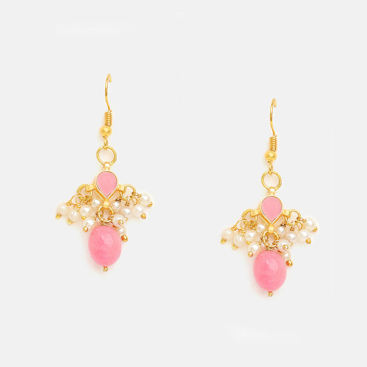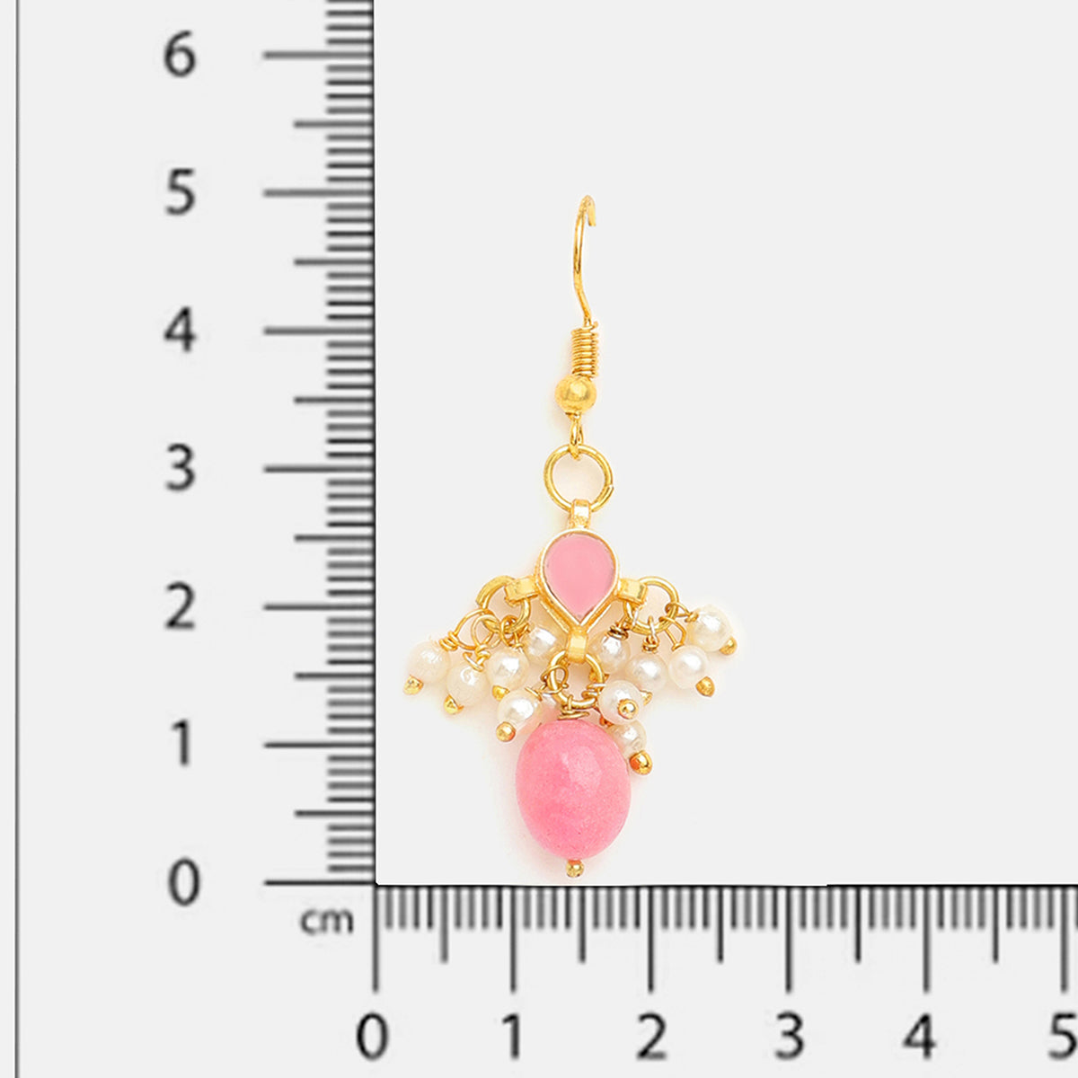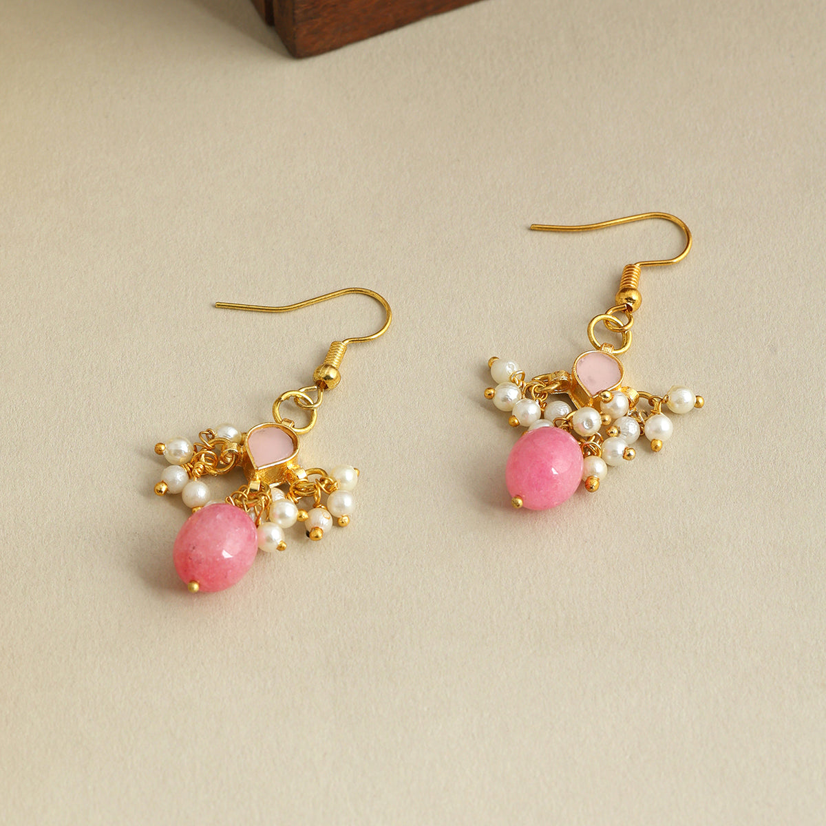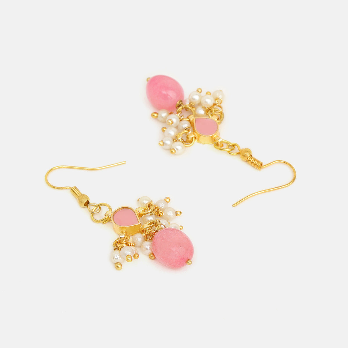 USE CODE: LOVE10These exquisite dangle earrings showcase a timeless blend of classic pearls and vibrant color. The design features a delicate arrangement of small, lustrous white freshwater pearls clustered above a single, striking, round pink pearl . Crafted with attention to detail, these pieces likely incorporate gold-toned findings and natural pearls, offering a sophisticated and feminine aesthetic. Perfect for adding a touch of elegance to both traditional and contemporary attire, these earrings are lightweight and designed for comfort and style.
