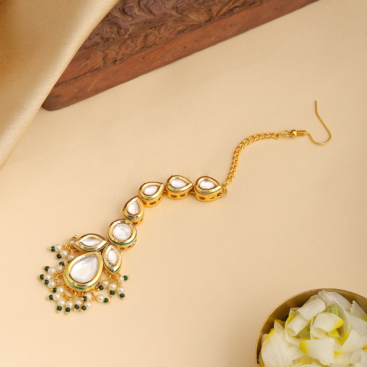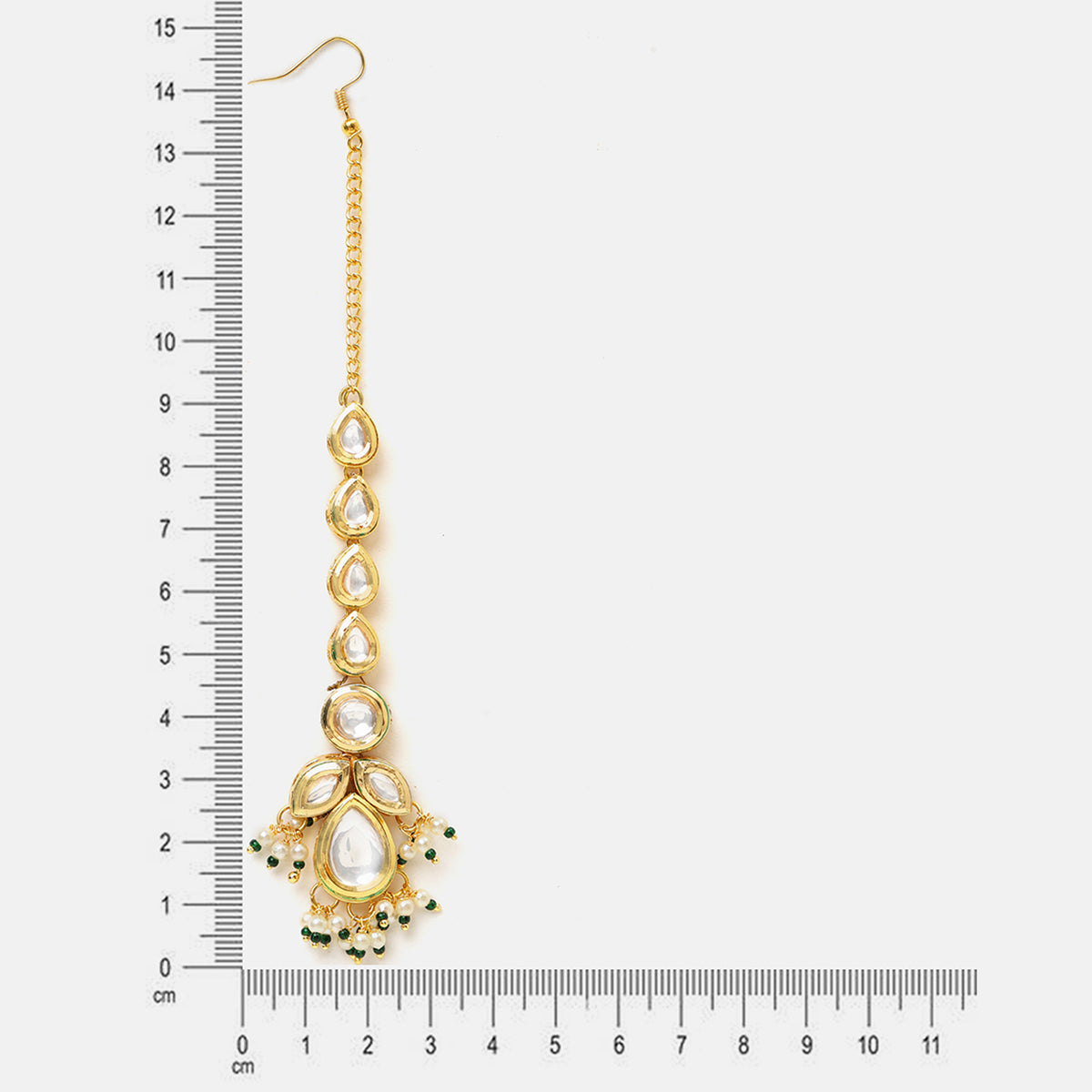 USE CODE: LOVE10As the Maang Tikka is an integral part of the Solah Shringar, the sixteen traditional bridal adornments in Indian culture. Here is our gold-toned piece with white, tear-shaped kundan suspended by a chain and rests on the wearer's forehead, typically in the center of the hair parting.