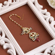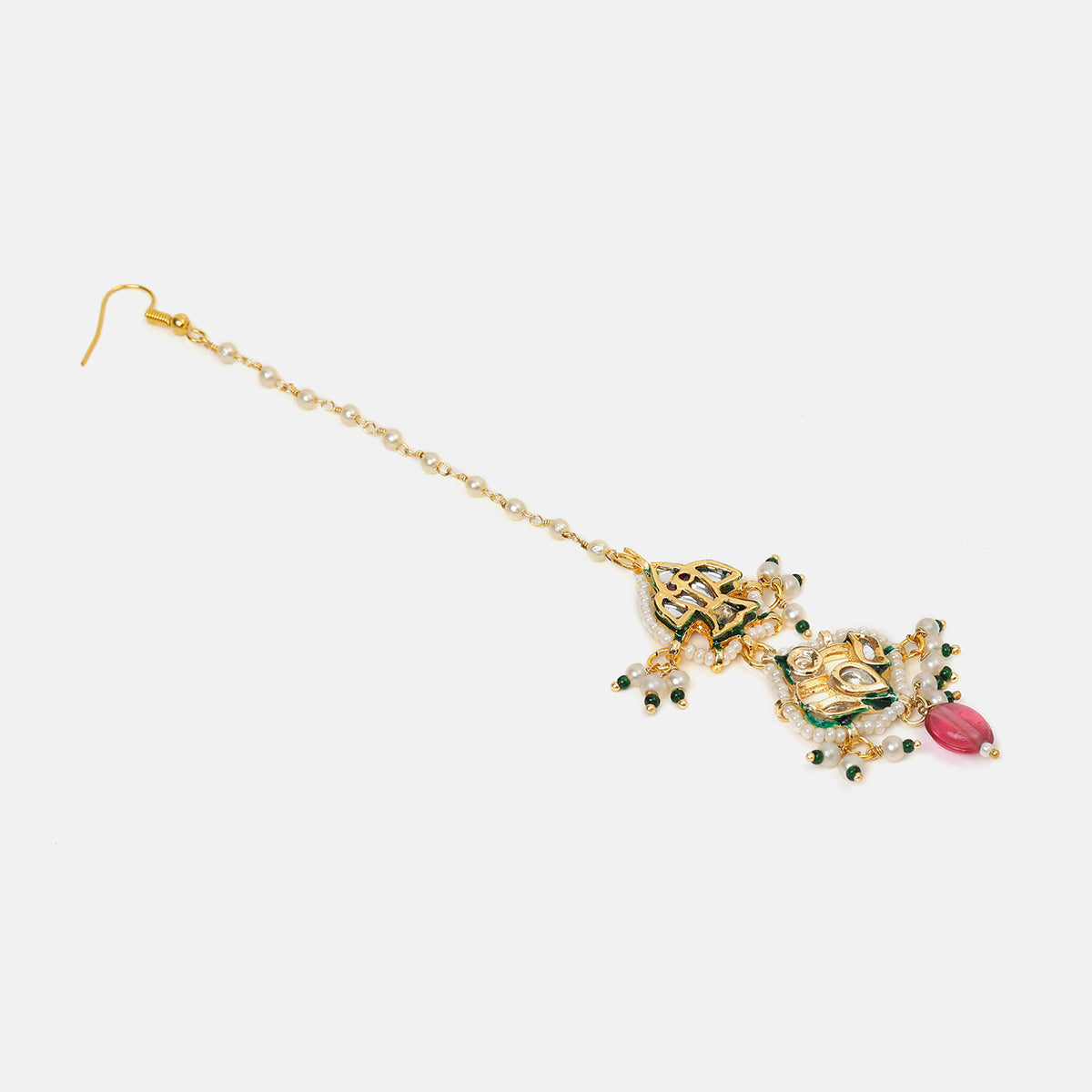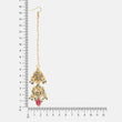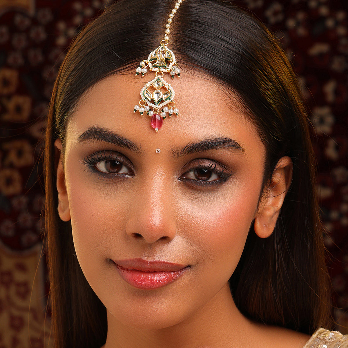 USE CODE: LOVE10A maang tikka that is crafted from polished brass with a gold-plated finish, designed in a classic double-tiered chandbali style. This eye-catching piece blends modern and ethnic styles, making it a versatile accessory suitable for traditional outfits.