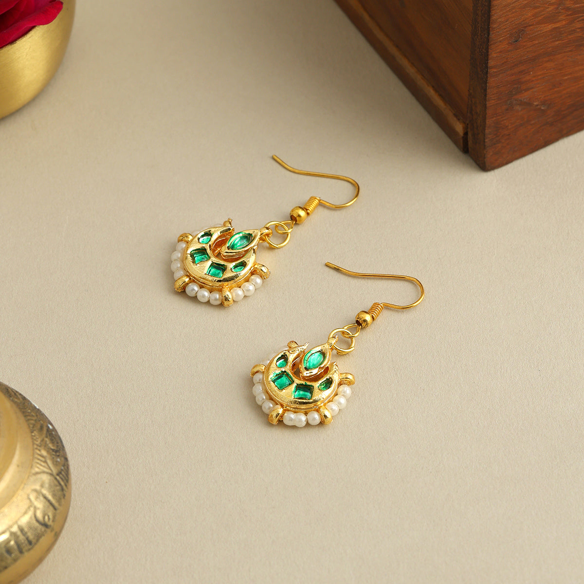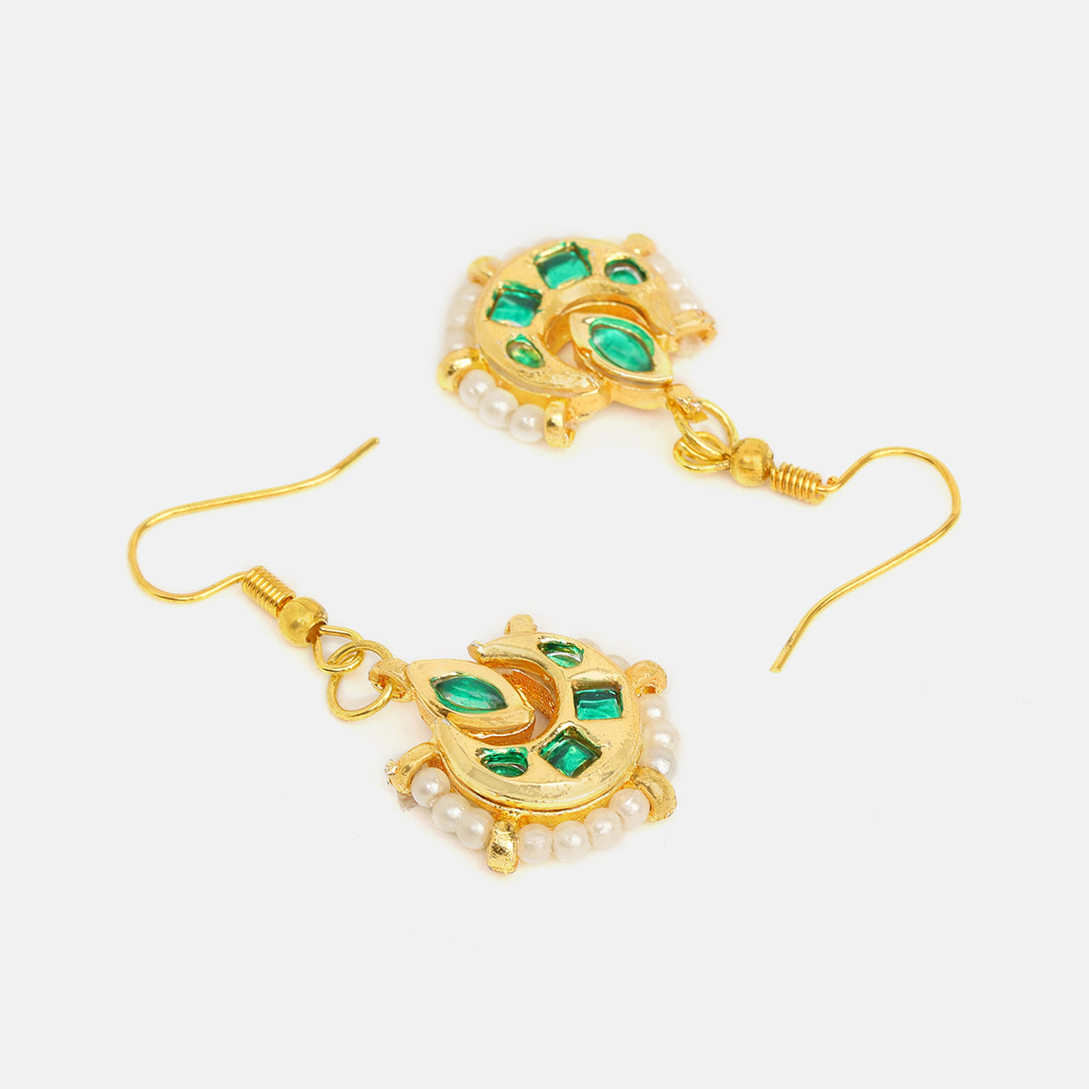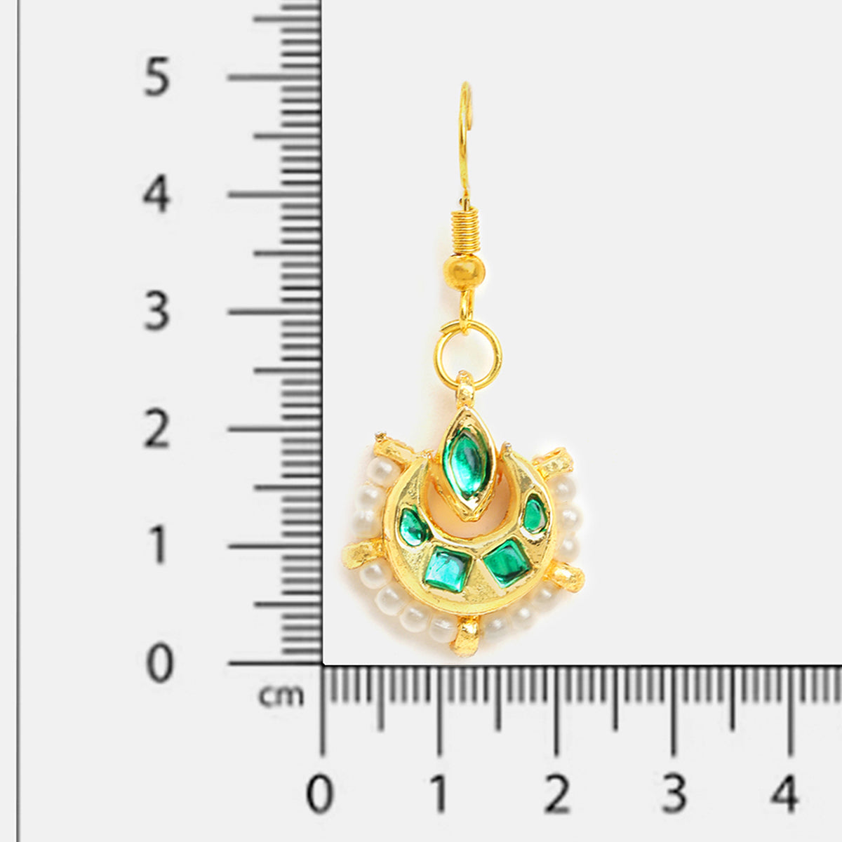 USE CODE: LOVE10Our Suhana Chaand Earrings set perfectly speaks about the beauty of simplicity with a touch of extra effort . The earrings are in a traditional Indian style, possibly a miniature Jhumka or a decorative drop design. The design is resembling a stylized floral at the base, from which small white beads are dangling. They are small, delicate, and appear lightweight, suitable for casual or semi-formal wear.